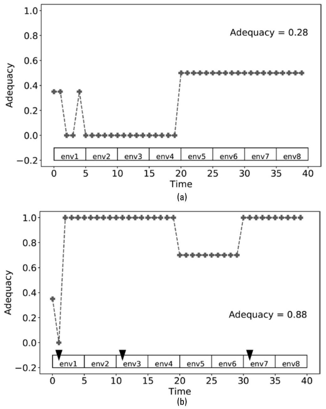 再次参考图10.5,最佳情况可能对应三个差异显著的环境——16、23和22——因为模型能有效泛化到其余20个环境中;而最差情况可能对应三个高度相似的环境——22、02和07——导致系统需要更长时间才能学会应对新情境,从而获得较低的充分性(adequacy)评分。