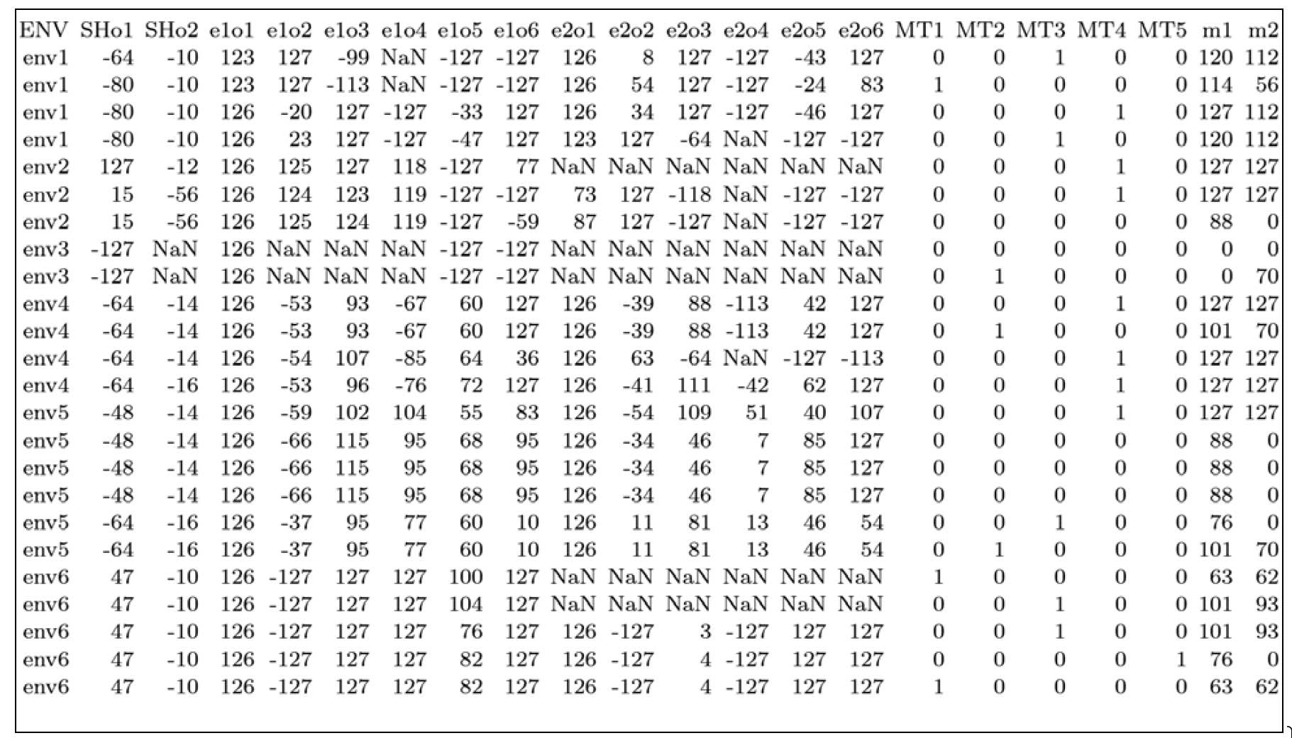 | env6 | 47 | -10 | 126 | -127 | 127 | 127 | 104 | 127 | NaN | NaN | NaN | NaN | NaN | NaN | 0 | 0 | 1 | 0 | 0 | 101 | 93 |