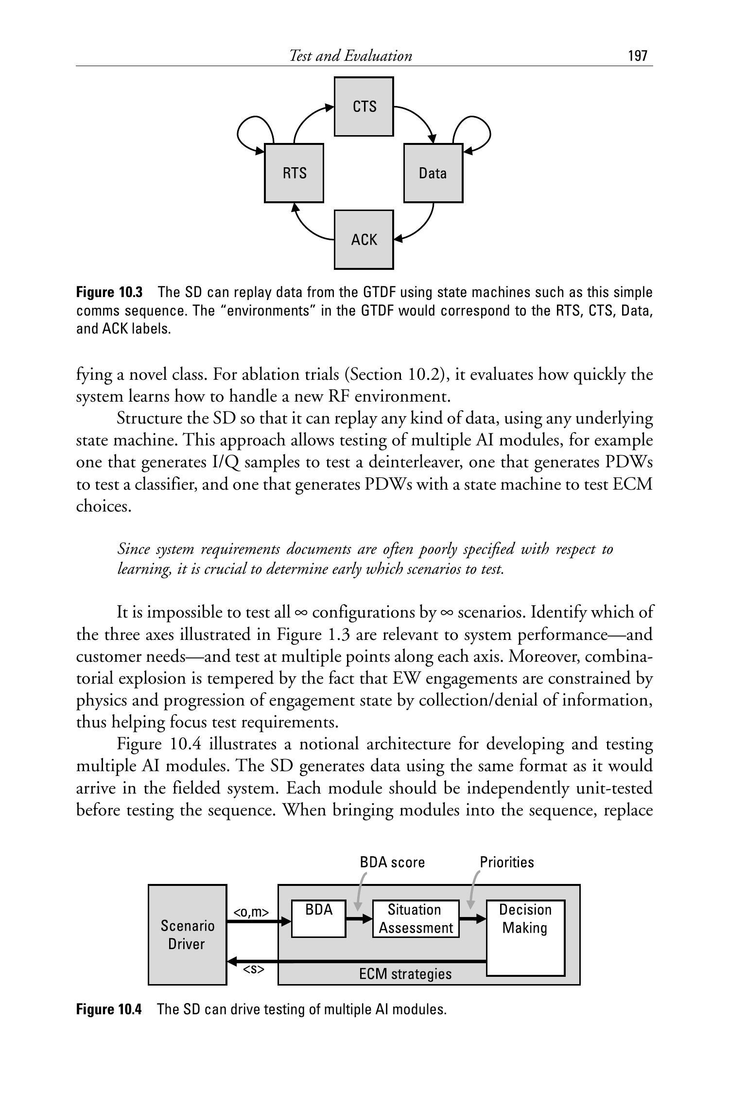 图10.4展示了一个用于开发和测试多个AI模块的概念性架构。场景驱动器(Scenario Driver, SD)生成的数据格式与实际部署系统中接收到的数据格式一致。在对整个处理序列进行测试之前,每个模块都应独立完成单元测试(unit test)。当将模块集成到序列中时,应将其余模块替换为“全知”(omniscient)组件——即始终正确的组件。(例如,为测试态势感知(Situation Awareness, SA)模块,决策管理(Decision Management, DM)模块可简化为一组人工编写的规则,而毁伤效果评估(Battle Damage Assessment, BDA)模块则精确知晓所选电子对抗措施(Electronic Countermeasures, ECM)的实际效果。)对BDA和SA模块的评估应采用加权准确率(weighted accuracy)(参见第10.3.1节或第10.3.2.3节),而对DM模块的评估则采用充分性(adequacy)指标(参见第10.3.3.1节)。