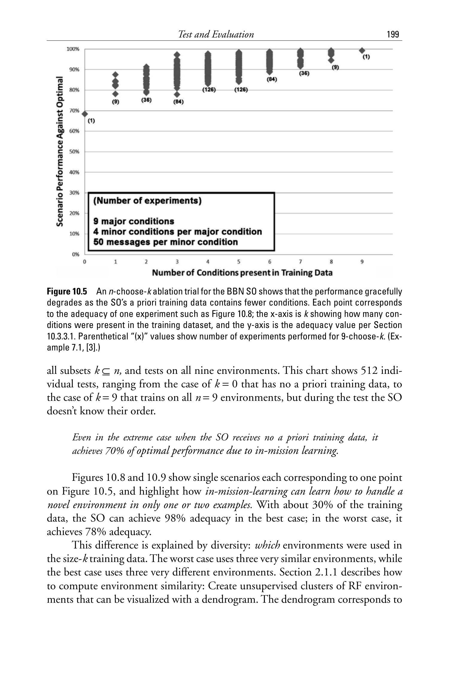 图10.5展示了在开发BBN认知引擎(BBN SO)(参见例7.1 [3])过程中收集的 \(n\)-choose-\(k\) 测试结果。针对 \(n=9\) 个环境中的每一个,SD 在所有可能的子集 \(k \subseteq n\) 上训练SO,并在全部九个环境上进行测试。该图表共包含512次独立测试,涵盖从 \(k=0\)(无任何先验训练数据)到 \(k=9\)(在全部 \(n=9\) 个环境上训练,但测试时SO不知道环境出现顺序)的各种情况。