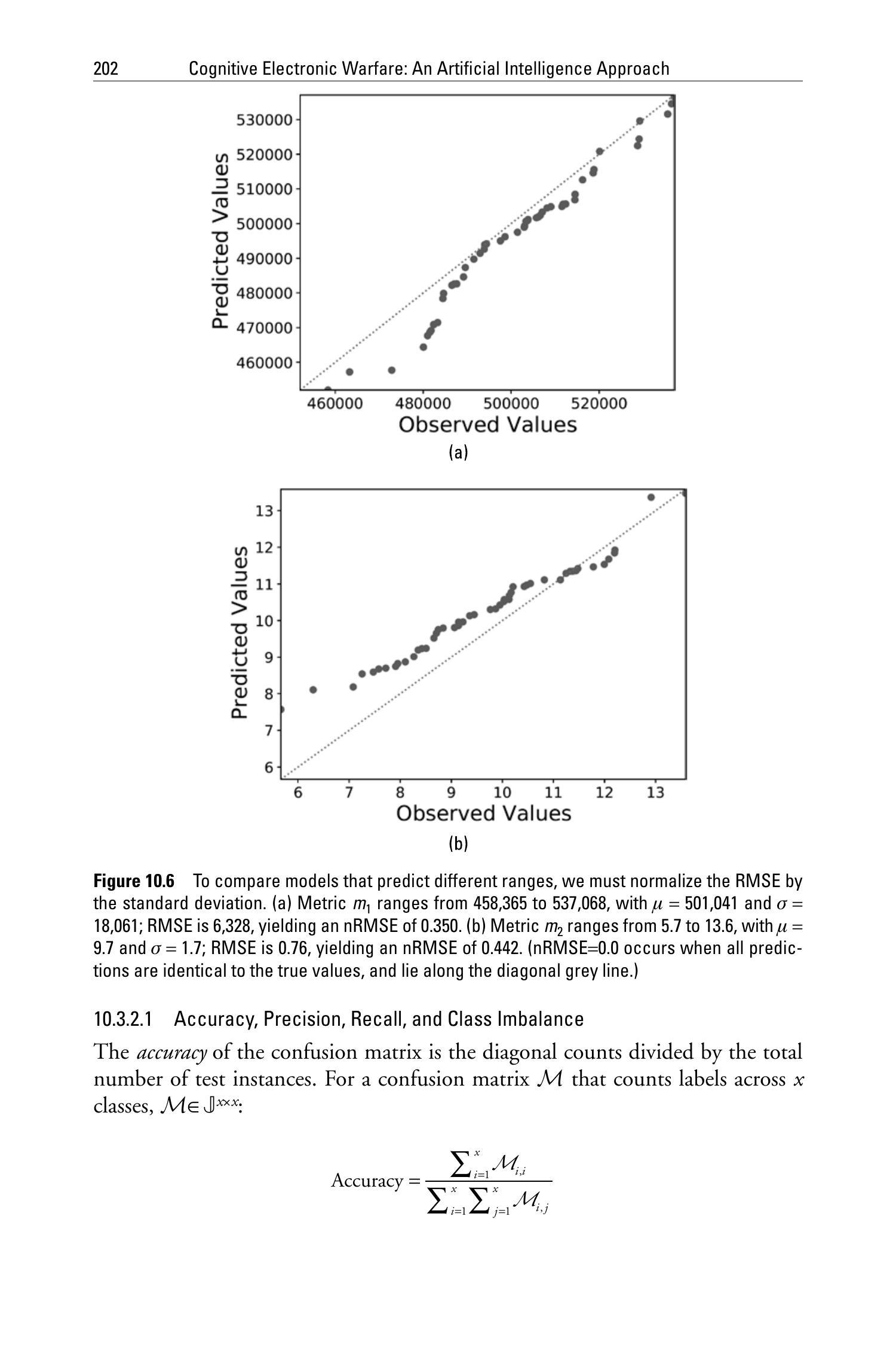 图10.6 为比较预测值范围不同的模型,必须将 RMSE 除以标准差进行归一化。(a)度量指标 \(m_{1}\) 的取值范围为 458,365 至 537,068,均值 \(\mu = 501,041\),标准差 \(\sigma = 18,061\);RMSE 为 6,328,对应 nRMSE 为 0.350。(b)度量指标 \(m_{2}\) 的取值范围为 5.7 至 13.6,均值 \(\mu = 9.7\),标准差 \(\sigma = 1.7\);RMSE 为 0.76,对应 nRMSE 为 0.442。(当所有预测值与真实值完全一致并落在灰色对角线上时,nRMSE = 0.0。)