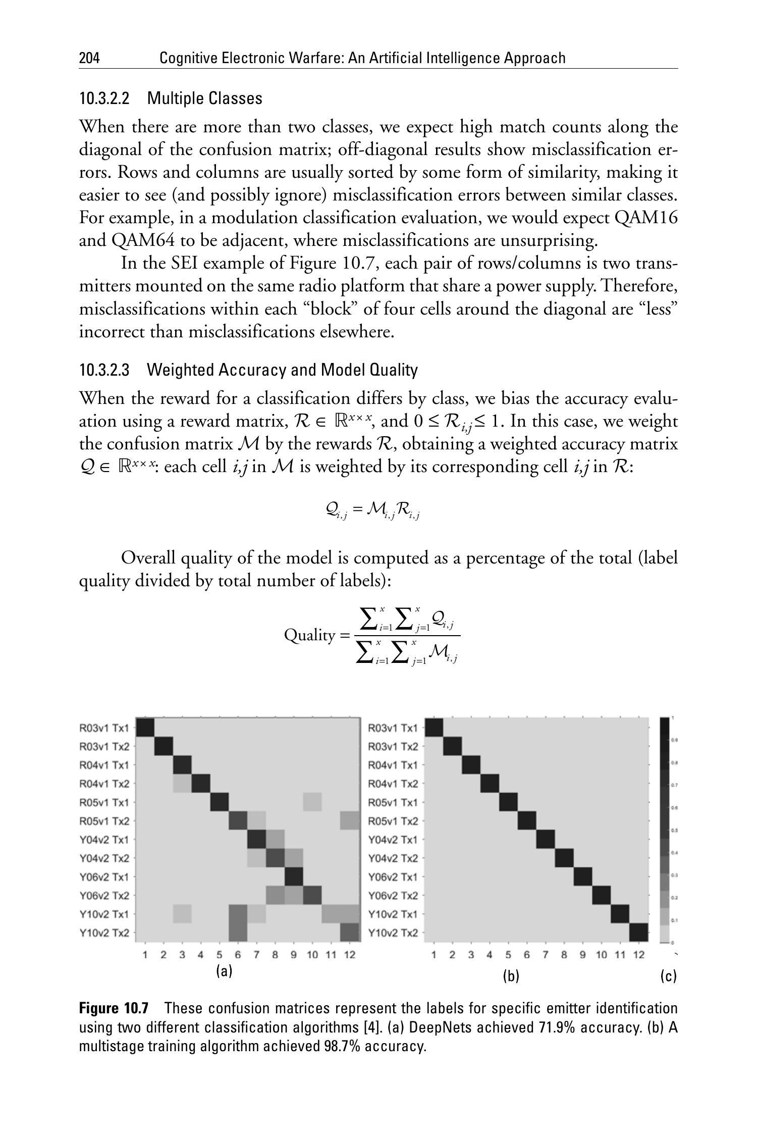 在电子战中,我们还需考虑这样的情形:多种电子防护(Electronic Protection, EP)/电子攻击(Electronic Attack, EA)策略在不同射频(RF)环境下产生不同的性能表现。例如,多种EP策略可能对同一类干扰机(jammer)提供防护,但其有效性各不相同。此类模型采用一种改进的混淆矩阵进行评估(参见第10.3.3节)。