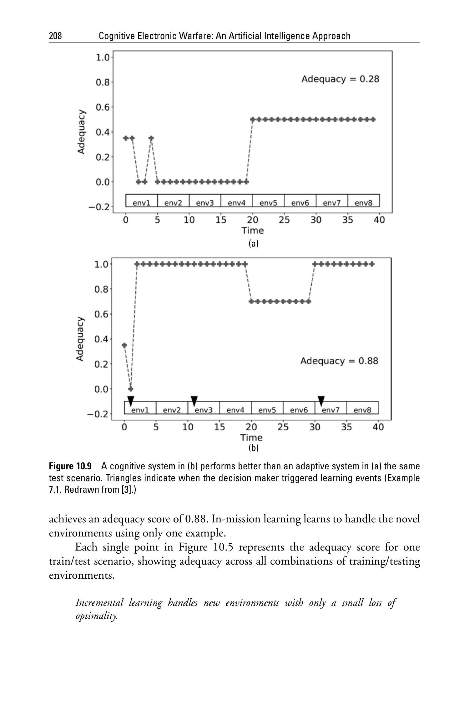 图10.8和图10.9分别展示了单个测试场景,各自对应图10.5中的一个数据点,并突出说明:任务中学习仅需一到两个样本即可学会如何应对一个全新环境。当训练数据约为完整数据集的 \(30\%\) 时,SO在最佳情况下可达到 \(98\%\) 的充分性;而在最差情况下,仍能达到 \(78\%\) 的充分性。