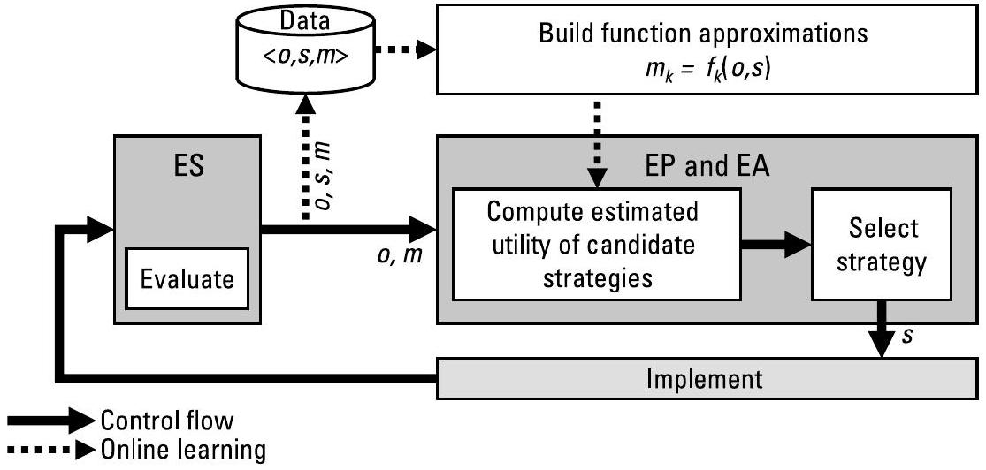 图 5.2 决策制定器基于近期可观测特征 \(o\) 和度量 \(m\) 的性能反馈选择策略 \(s\)。可选的在线学习步骤根据经验数据更新性能模型。(基于例 7.1。)