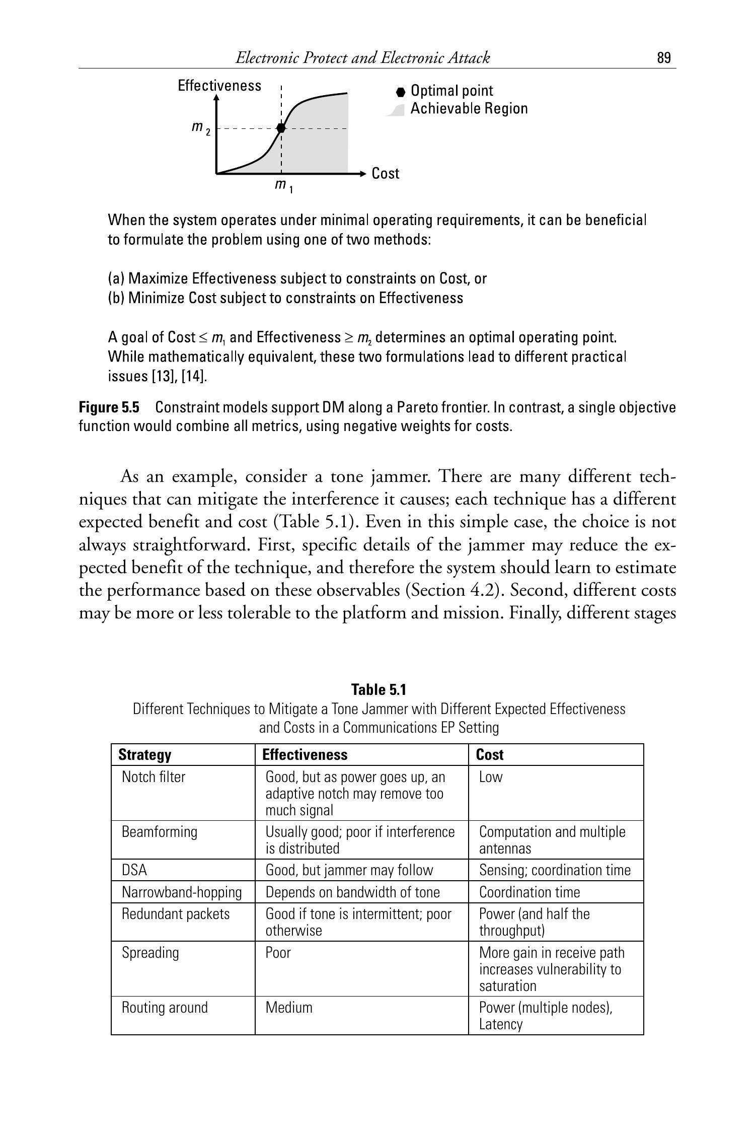 举例而言,考虑一个单音干扰机(tone jammer)。存在多种技术可用于缓解其所造成的干扰;每种技术具有不同的预期效能与成本(见表 5.1)。即使在此简单场景中,选择也并非总是显而易见。首先,干扰机的具体特性可能降低某项技术的预期效能,因此系统应学会基于可观测特征(observables)估计其性能(见第 4.2 节)。其次,不同成本对平台和任务的可接受程度可能不同。最后,任务的不同阶段可能具有不同优先级,从而要求选择不同的技术,即便这些技术的预期效能相同。