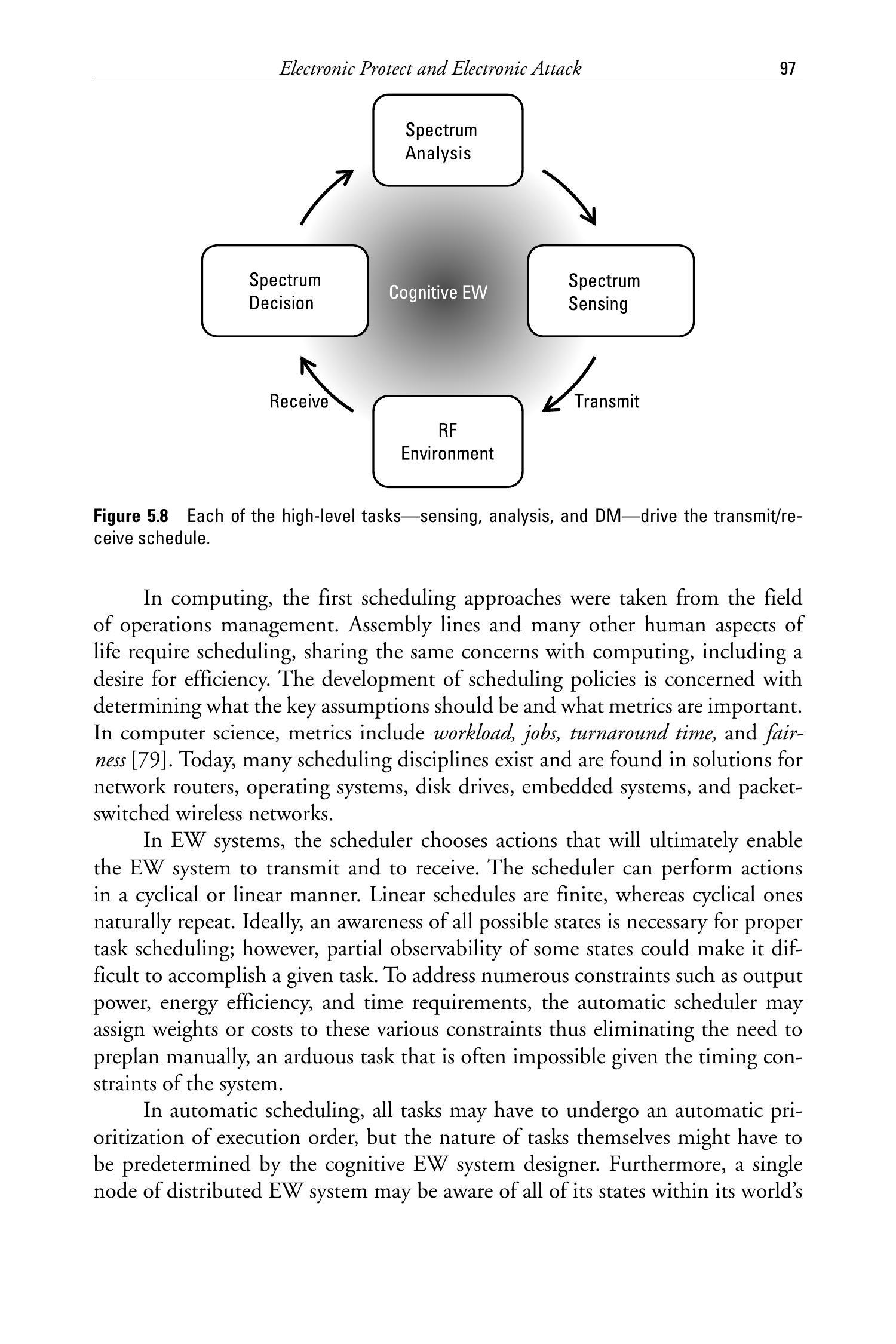 第 2 章介绍了目标函数,第 4 章(电子支援,ES)解释了可观测特征(observables)如何描述环境。本章则聚焦于如何选择策略,重点讨论优化与调度。5.1 节介绍优化方法,5.2 节讨论调度问题。5.3 节阐述了决策制定(DM)的一项理想属性:其实现必须具备可中断性(interruptible)。5.4 节探讨了在分布式节点网络中进行联合优化的方法。