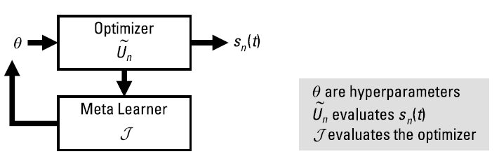 图 5.7 元学习利用元效用函数 \(\mathcal{J}\) 优化优化器的超参数 \(\theta\)。