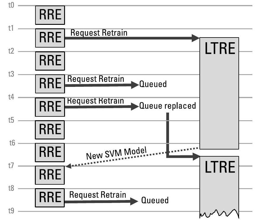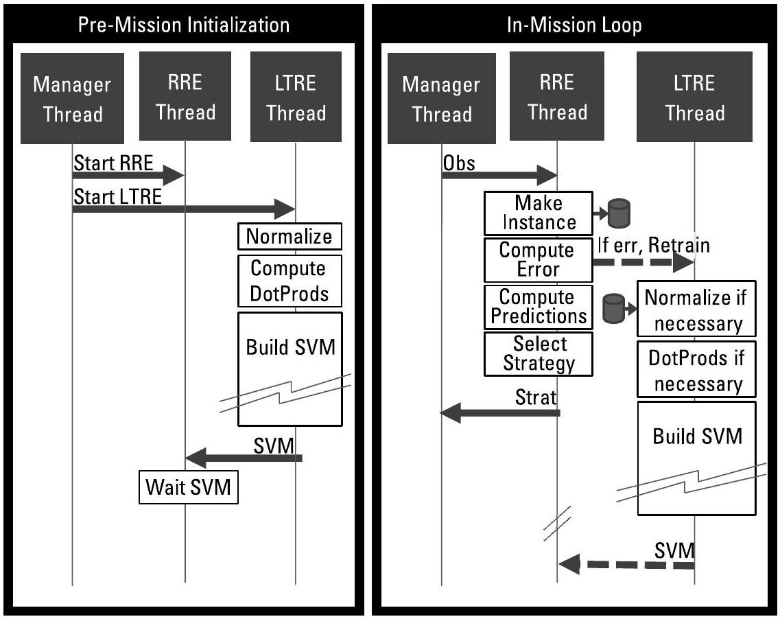 BBN SO(见例7.1)中使用的支持向量机(SVMs, Support Vector Machines)要求射频推理引擎(RRE, Radio Frequency Reasoning Engine)和长期推理引擎(LTRE, Long-Term Reasoning Engine)运行在同一进程的不同线程中。RRE 和 LTRE 均需高频、低延迟地访问同一个内部数据存储(datastore);训练数据中被选中的实例将成为支持向量(support vectors)。图9.5展示了各功能在线程间的分布情况,支撑了图5.2所示的功能结构。这项工作凸显了构建认知电子战(cognitive EW)解决方案所必需的一项关键活动:
