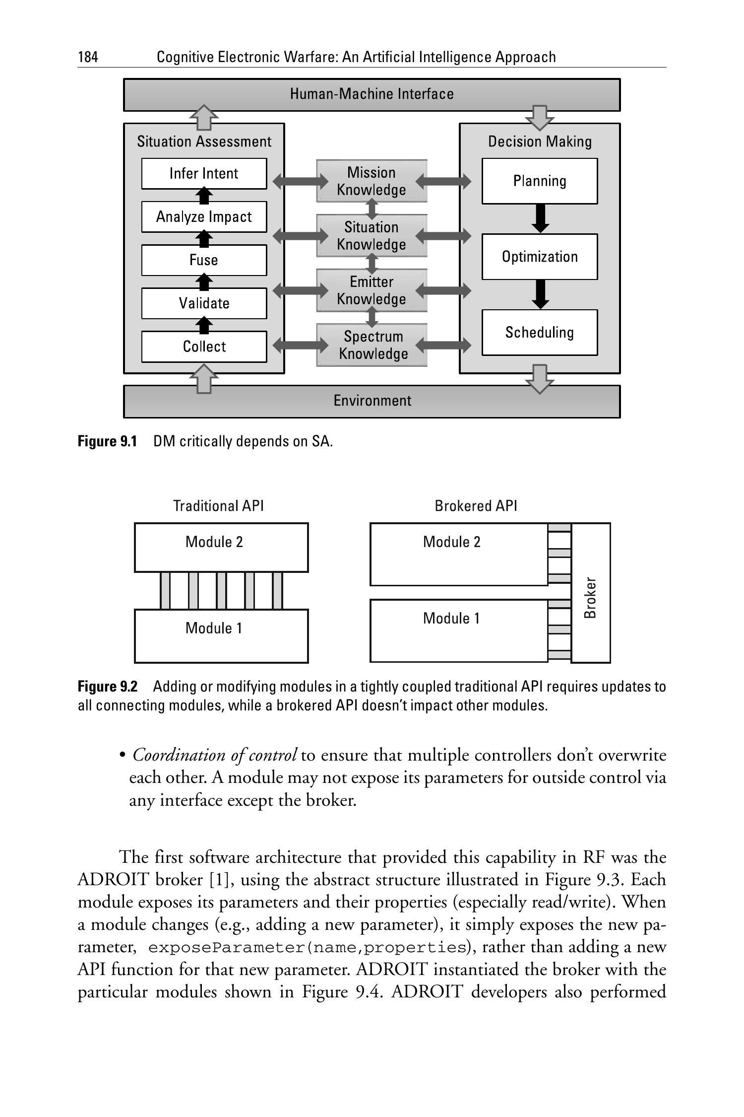 基于第1至8章中对态势感知(SA, Situational Awareness)和决策制定(DM, Decision Making)的深入理解,我们可以将图1.4中认知系统的组成部分重新绘制为如图9.1所示。模块化架构(modular architecture)为这些能力提供了基础支撑,使得不同技术能够提供不同的服务,并确保信息与控制流的一致性。本章简要探讨了软件与硬件架构方面的考虑,并提供了一份简短的开发者路线图。