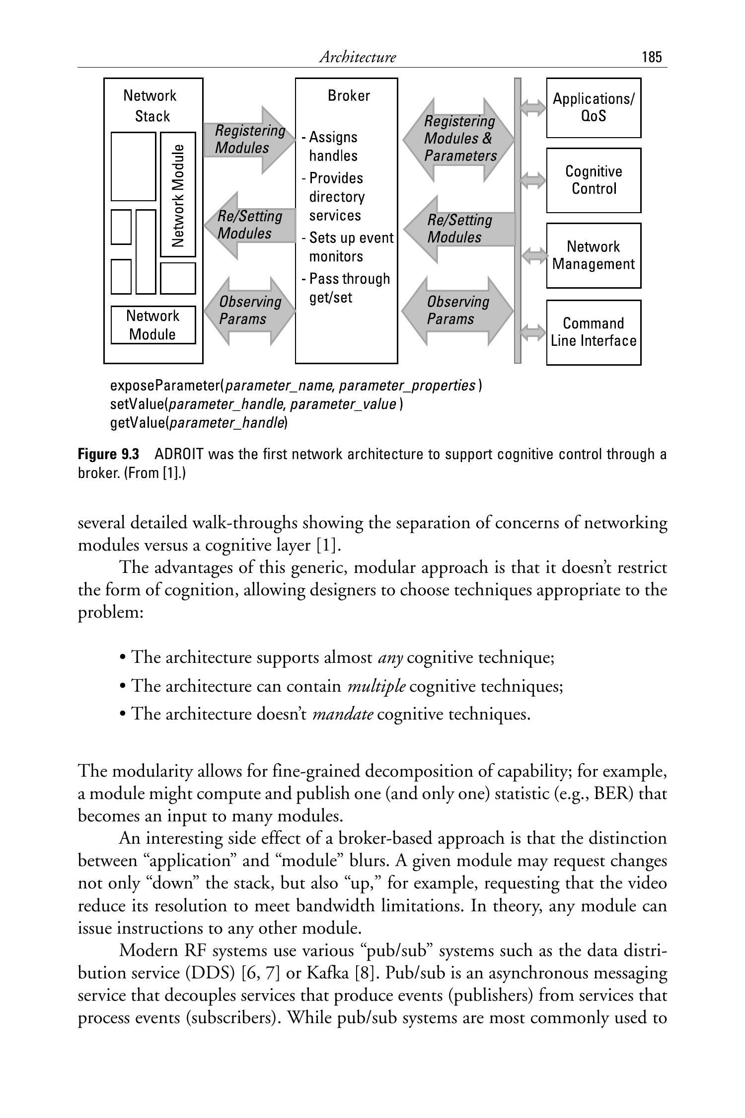 首个在射频(RF, Radio Frequency)领域提供此类能力的软件架构是ADROIT代理(ADROIT broker)[1],其采用的抽象结构如图9.3所示。每个模块暴露其参数及其属性(尤其是读/写权限)。当模块发生变更(例如新增一个参数)时,只需调用 exposeParameter(name, properties) 来暴露该新参数,而无需为该参数新增一个API函数。ADROIT通过图9.4所示的具体模块实例化了该代理。ADROIT的开发人员还进行了若干详细案例演示,清晰展示了网络模块与认知层(cognitive layer)之间的关注点分离(separation of concerns)[1]。