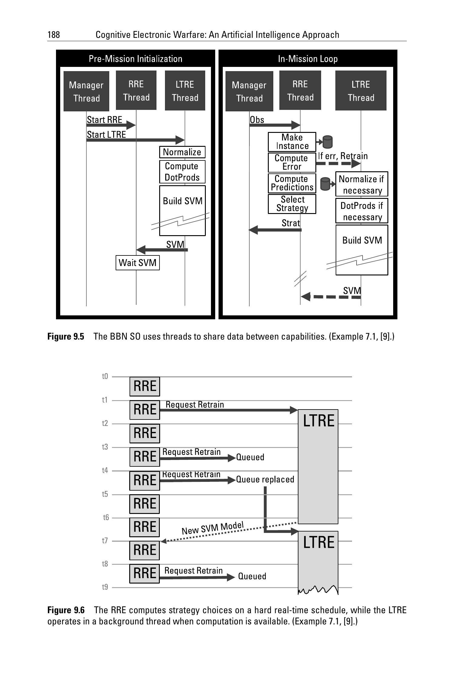 BBN SO(见例7.1)中使用的支持向量机(SVMs, Support Vector Machines)要求射频推理引擎(RRE, Radio Frequency Reasoning Engine)和长期推理引擎(LTRE, Long-Term Reasoning Engine)运行在同一进程的不同线程中。RRE 和 LTRE 均需高频、低延迟地访问同一个内部数据存储(datastore);训练数据中被选中的实例将成为支持向量(support vectors)。图9.5展示了各功能在线程间的分布情况,支撑了图5.2所示的功能结构。这项工作凸显了构建认知电子战(cognitive EW)解决方案所必需的一项关键活动: