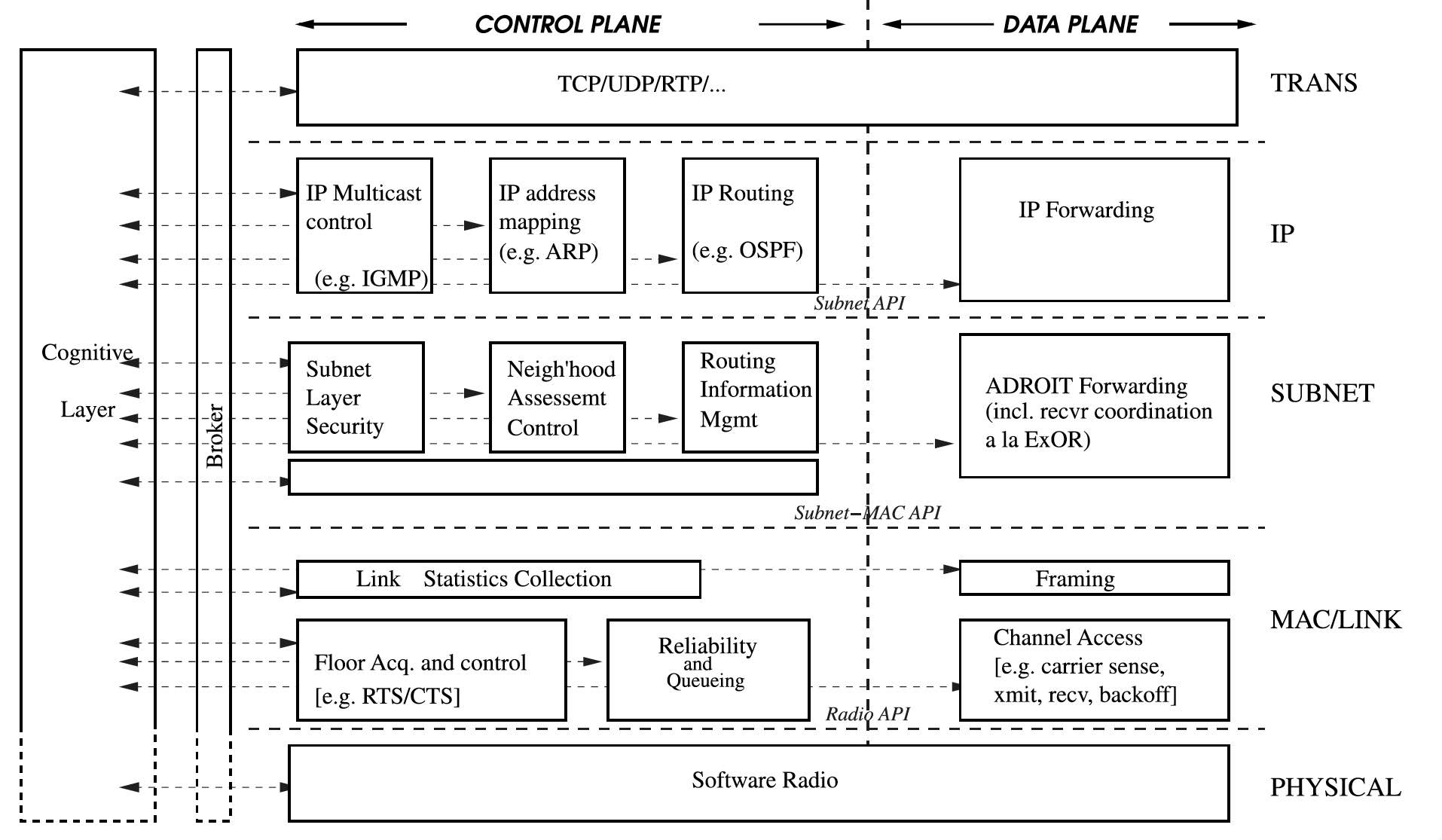 图9.4 ADROIT利用代理为模块化网络协议栈(modular networking stack)提供认知控制。(引自[1]。)