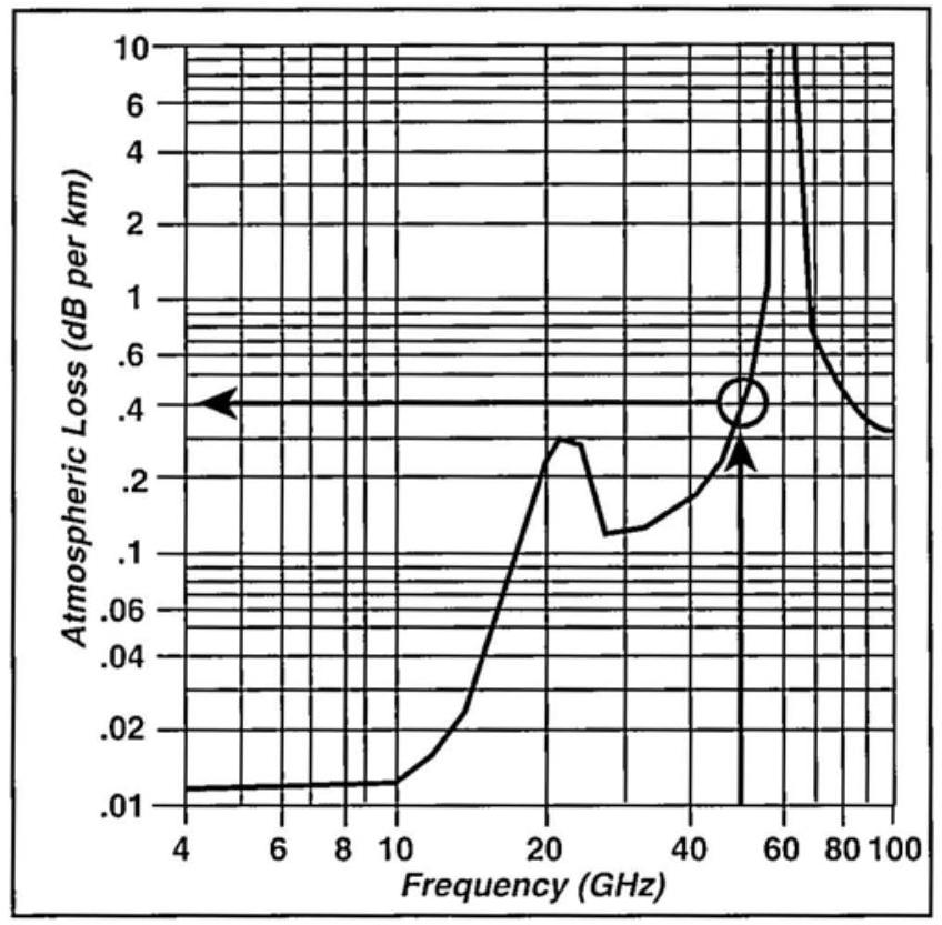 大气衰减是非线性的,因此最好直接通过图 2.3 查表确定。在示例中,传输频率为 50 GHz。从 50 GHz 点画一条直线到曲线,再向左延伸到衰减刻度,可以得到每千米的衰减值。在示例中为 0.4 dB/km,因此 \(50 \,\mathrm{GHz}\) 信号传输 20 km 的大气衰减为 8 dB。请注意,在大多数点对点战术通信使用的频率下,大气衰减很低,通常在链路计算中可忽略。但在高微波和毫米波频率以及地球与卫星之间的全大气层传输中,它变得非常显著。