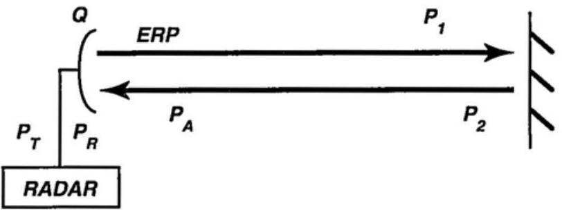 \(P_{T}\) 是雷达发射机进入天线的功率(dBm);\(G\) 是雷达天线主瓣增益(dB);ERP 是有效辐射功率;\(P_{1}\) 是到达目标的信号功率(dBm);\(P_{2}\) 是目标反射回雷达的信号功率(dBm);\(P_{A}\) 是到达雷达天线的信号功率(dBm);\(P_{R}\) 是进入雷达接收机的接收功率(dBm)。