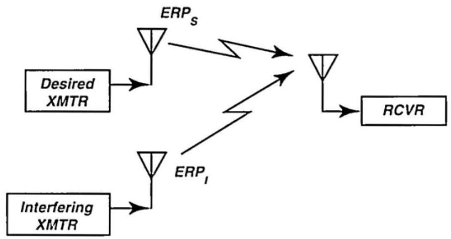 其中:\(P_{S}\) = 期望信号的接收功率(即接收机输入);\(P_{I}\) = 干扰信号的接收功率;\(\mathrm{ERP}_{S}\) = 期望信号的有效辐射功率;\(\mathrm{ERP}_{I}\) = 干扰信号的有效辐射功率;\(D_{S}\) = 到期望信号发射机的路径距离;\(D_{I}\) = 到干扰信号发射机的路径距离。
