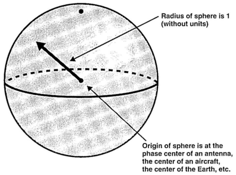 图 2.14 在以发射机为球心的单位球上,速度矢量和接收机的方位与俯仰构成两个直角球面三角形。