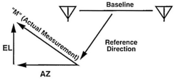 此例假设一个简单的比幅测向系统。DF 系统测量从参考方向(通常是天线基线中心)到信号到达方向的真实角度。在仅测方位系统中,该测量角度被报告为到达方位(即测量角度加上参考方向的方位)。