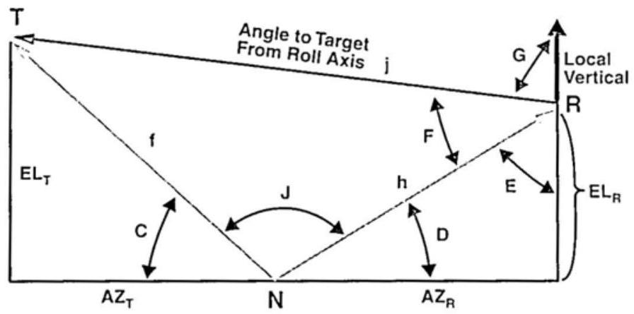 图 2.16 中的两个直角球面三角形和一个球面三角形用于计算目标与滚转轴之间的角距离 \(j\):