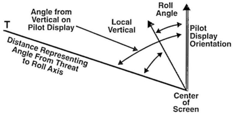 图 2.17 操作员屏幕上威胁显示符号的位置由其到滚转轴的角距离,以及威胁位置相对于局部垂直方向的偏移角与飞机滚转角之和共同决定。