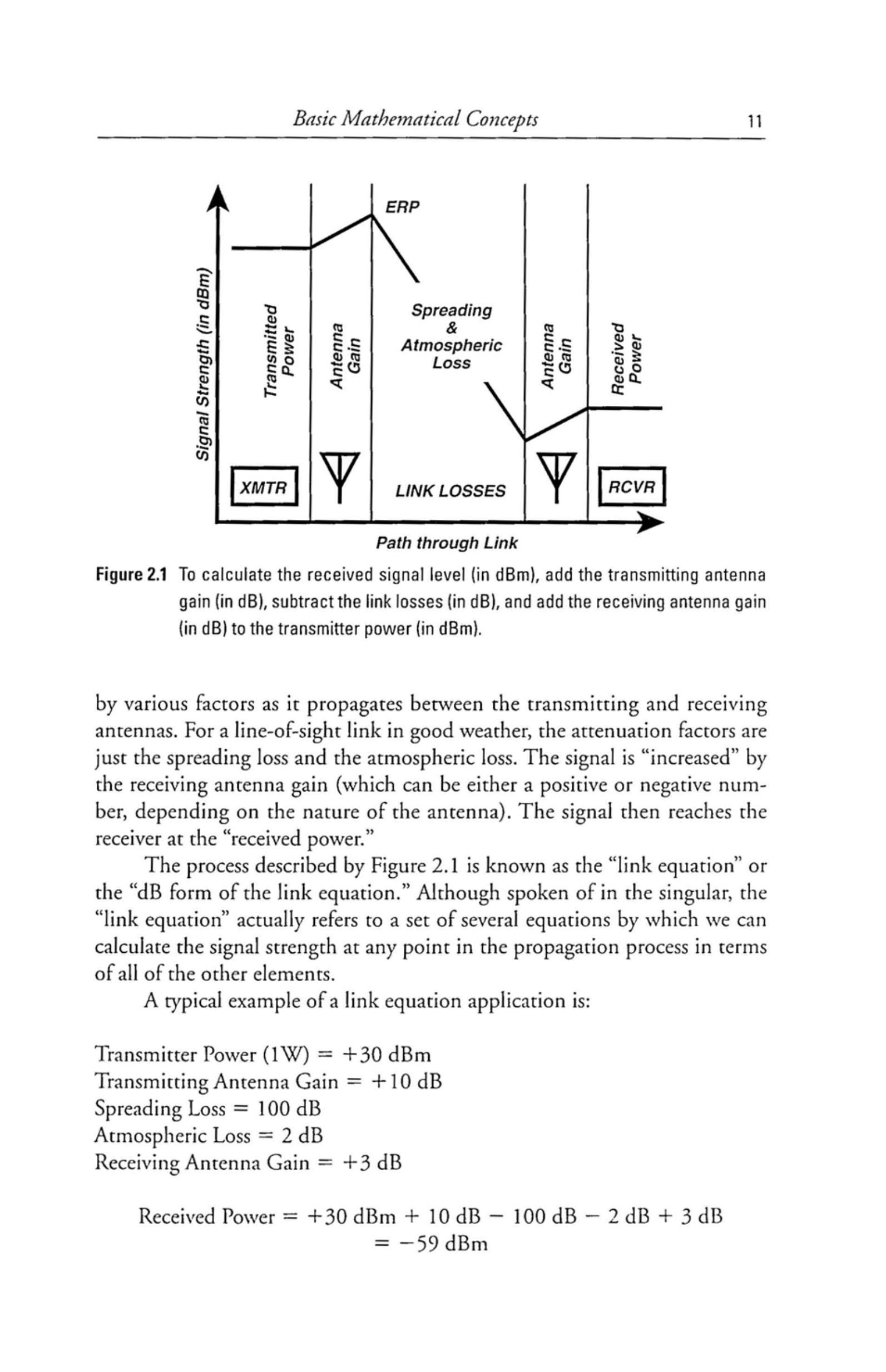 基本通信链路,或有时称为“单向链路”,由一个发射机(XMTR)、一个接收机(RCVR)、发射和接收天线,以及两天线之间的传播路径组成。图 2.1 展示了无线电信号在链路中传输时强度的变化。该图使用 dBm 表示信号强度,并用 dB 表示信号强度的增加或减少。
