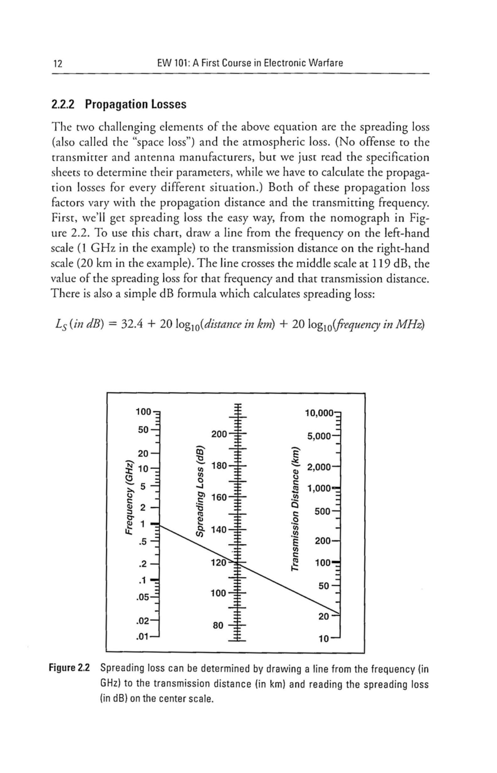 你会认出之前介绍的扩展损耗公式 \([32.4 + 20 \log(D) + 20 \log(F)]\),为了方便,常数 32.4 通常取整为 32。还有一个用于目标雷达截面积所致信号反射因子的简便公式:\([-39 + 10 \log(\sigma) + 20 \log(F)]\)。该公式将在第 10 章中推导并详细讨论。