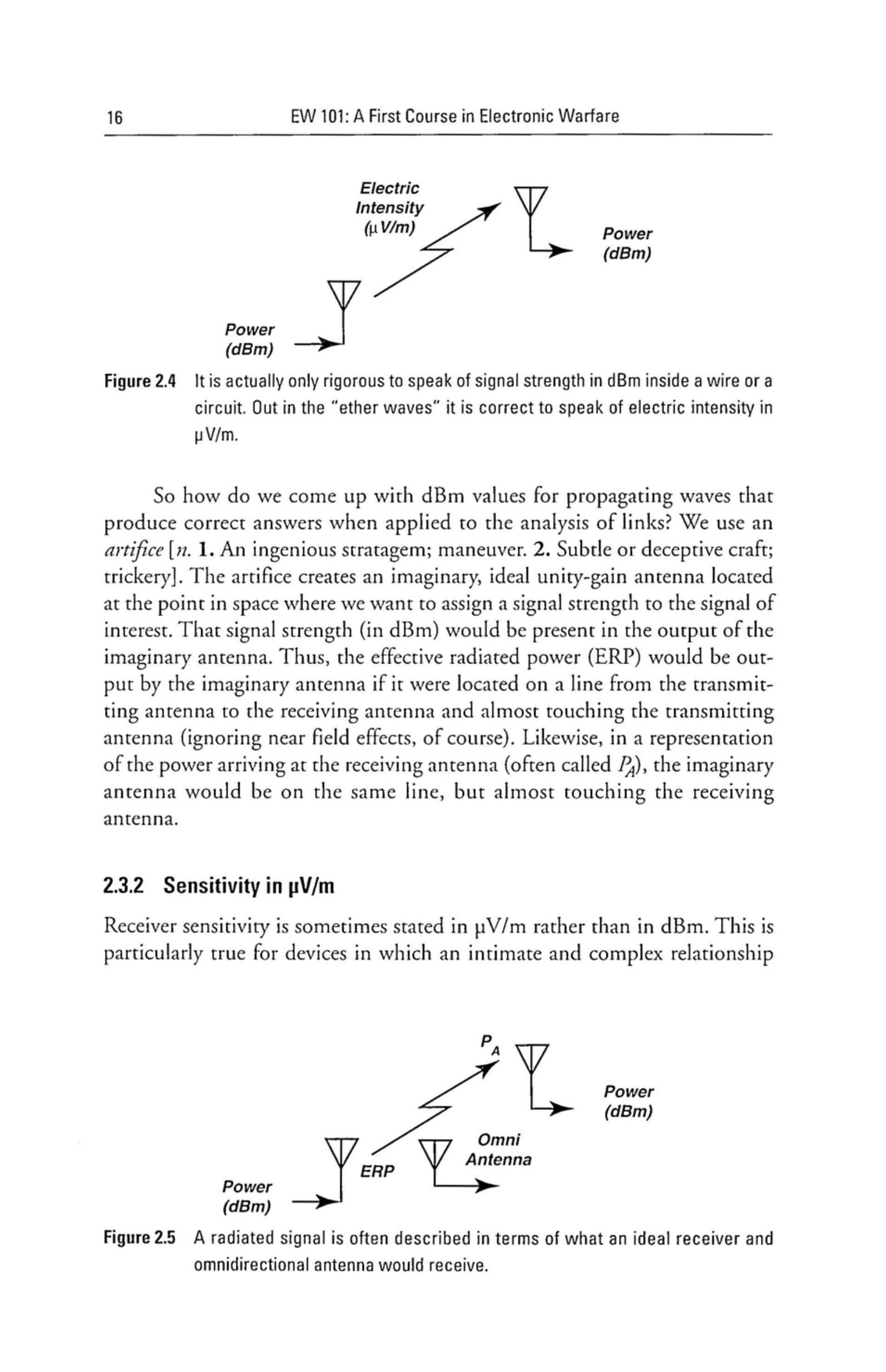 本书中给出的链路方程公式(以及大多数从事系统级电子战工作的人员所用的公式)存在一个严重的逻辑缺陷。但它们让我们的工作简单得多,以至于我们愿意竭力捍卫它们,即使面对那些将严谨视为信条的人。缺陷在于,我们在电磁波,英文中有时亦称“以太波(ether waves)”中(即发射天线和接收天线之间)以 dBm 表示信号功率。问题是,dBm 只是毫瓦的对数表示。dBm 表示的信号强度是“功率”,而电功率只在导线或电路中定义。在从发射天线传播到接收天线的过程中,信号必须用“电场强度”准确描述,最常见的量化方式是以每米微伏(\(\mu \mathrm{V}/\mathrm{m}\))表示。(见图 2.4 和图 2.5。)
