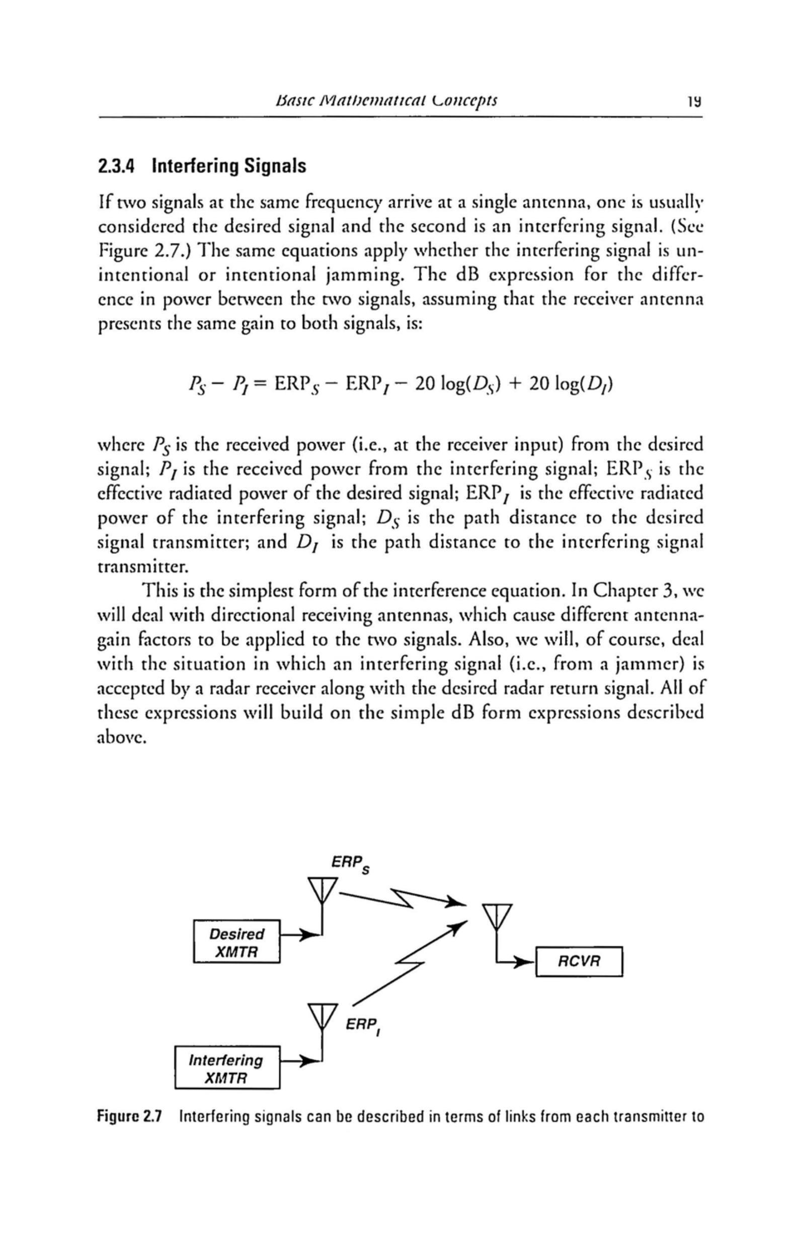 如果两个相同频率的信号到达同一个天线,其中一个通常被视为期望信号,另一个为干扰信号。(见图 2.7。)无论干扰信号是无意的还是有意的干扰,公式都是相同的。假设接收天线对两信号提供相同增益,两个信号功率差的 dB 表达式为: