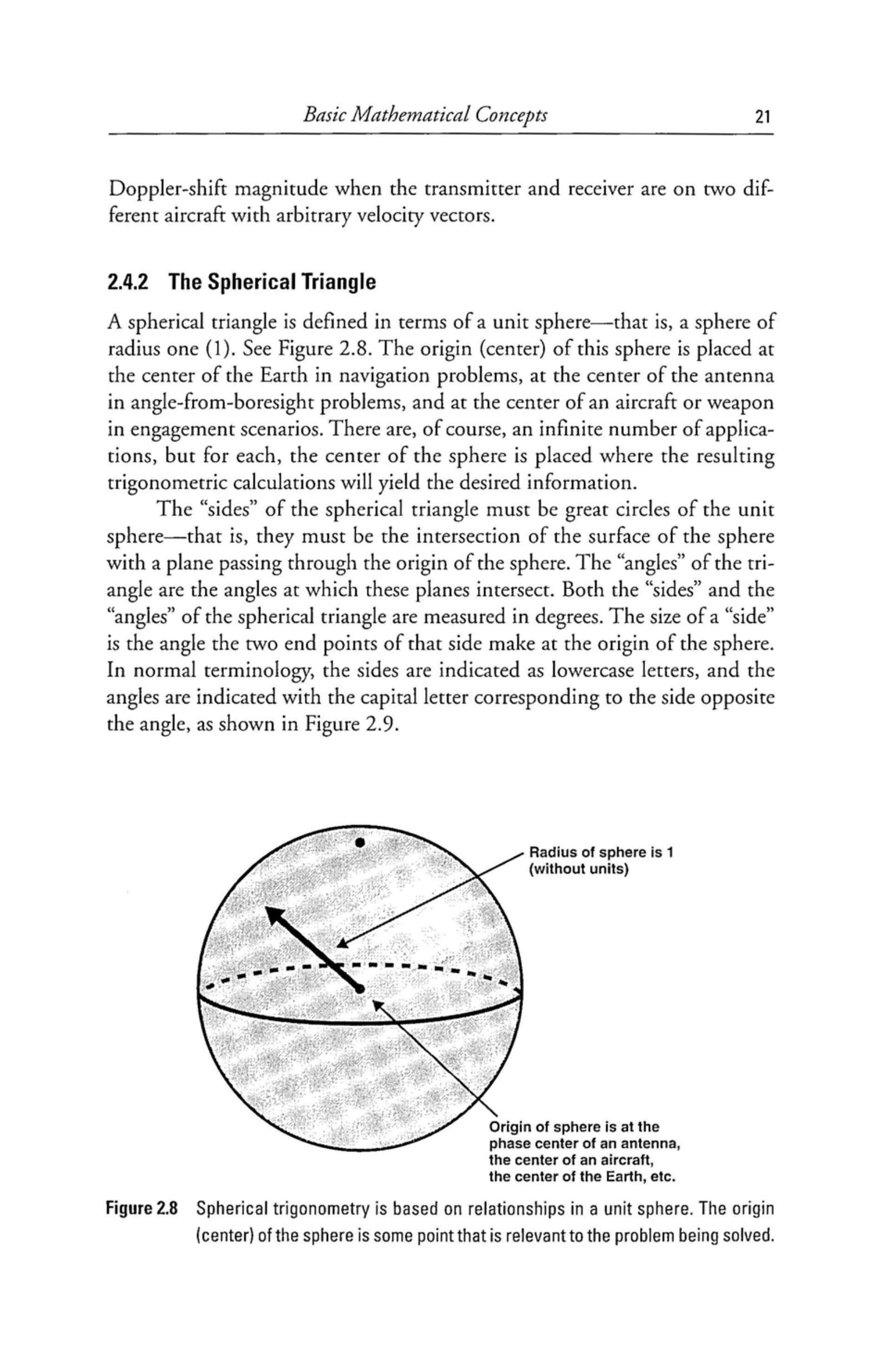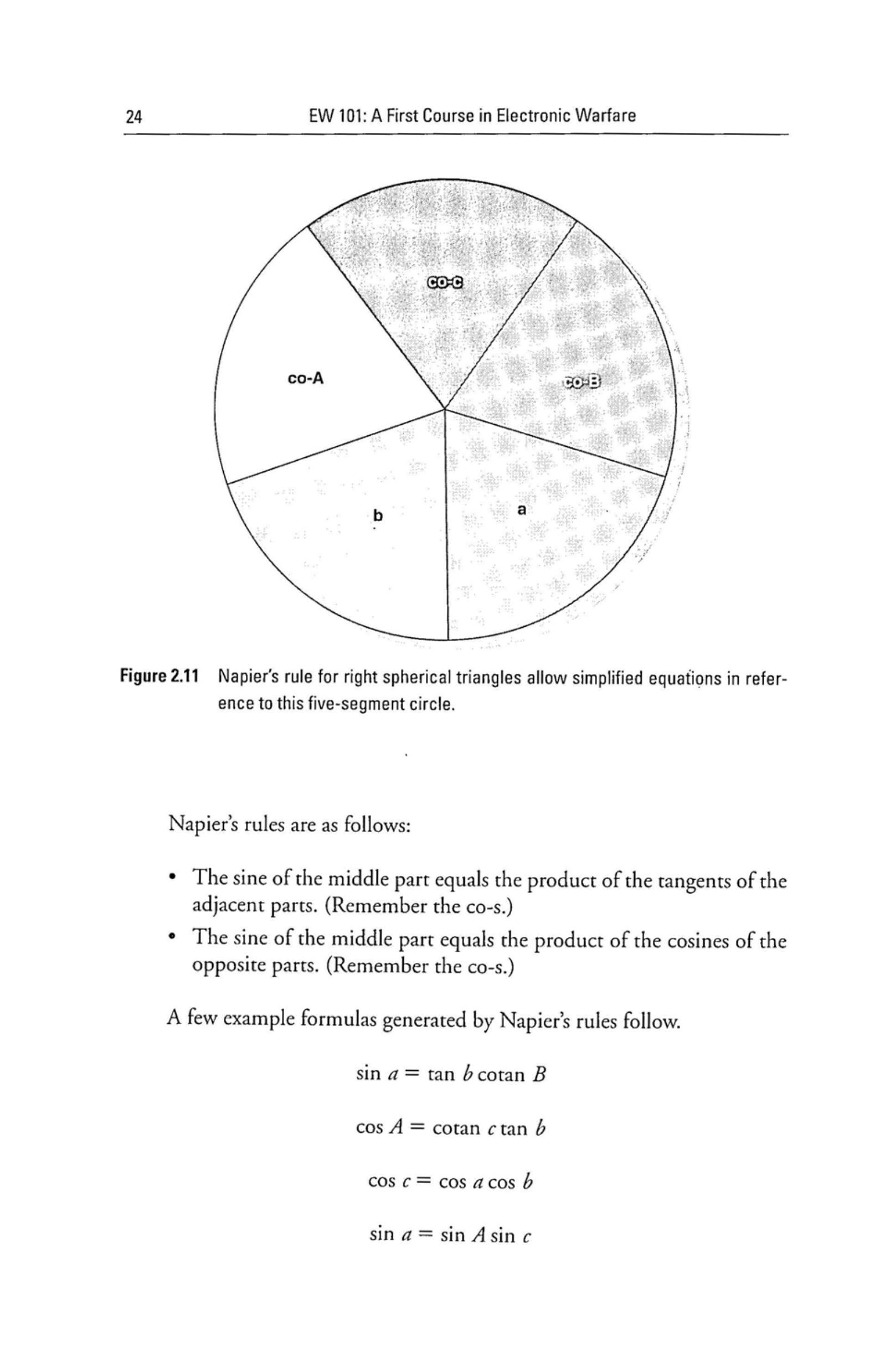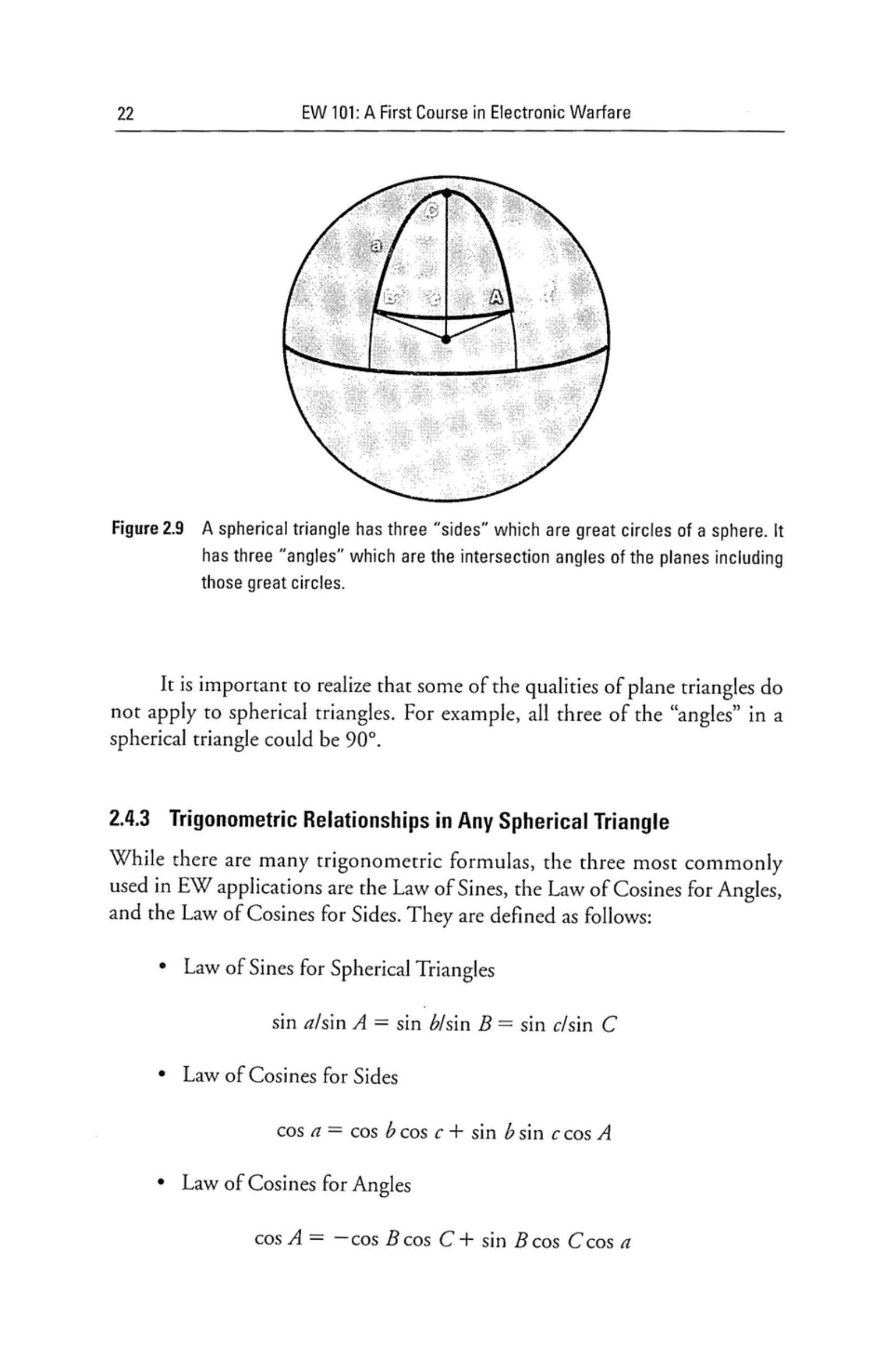 正如你将看到的,当这些公式应用于实际电子战问题时,如果能够将问题设定为包含一个直角球面三角形,相关的球面运算数学将大大简化。