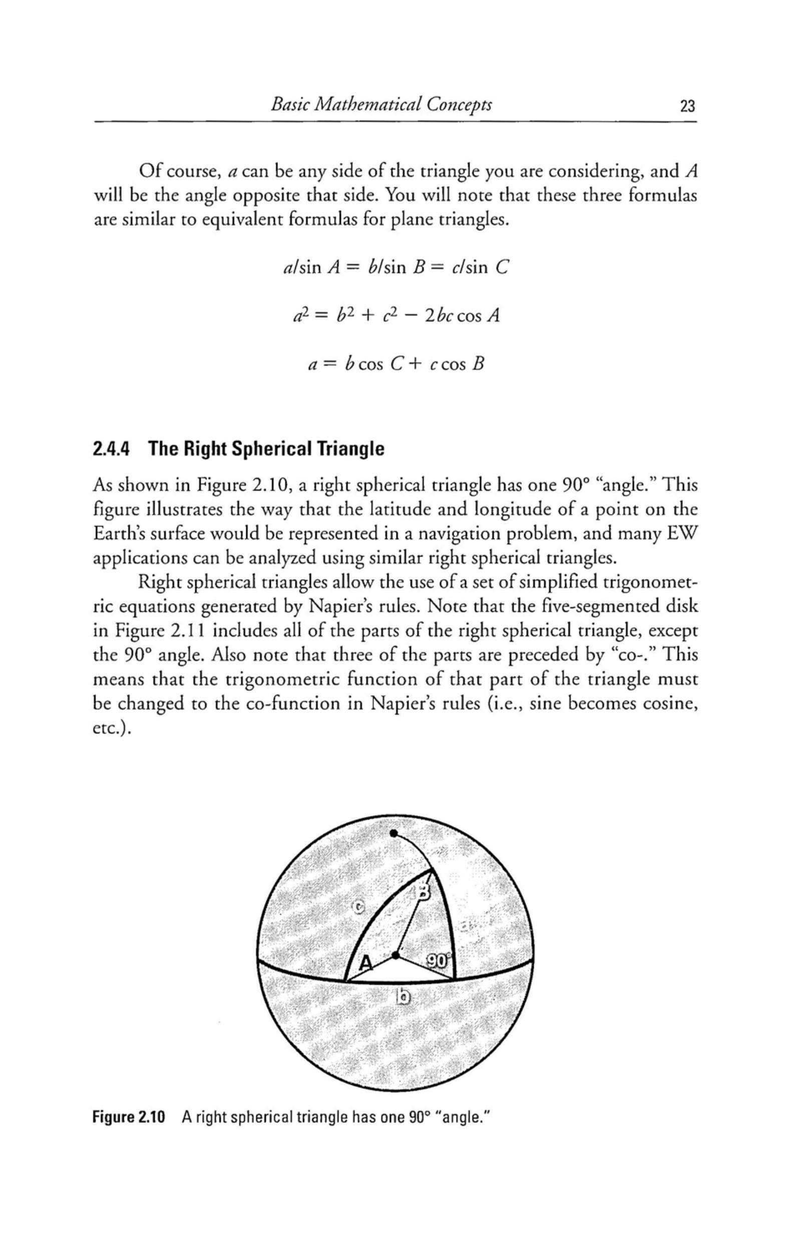 如图 2.10 所示,直角球面三角形有一个 \(90^{\circ}\) 的“角”。该图说明了地球表面某点的经纬度在导航问题中的表示方式,许多电子战应用也可以用类似的直角球面三角形来分析。