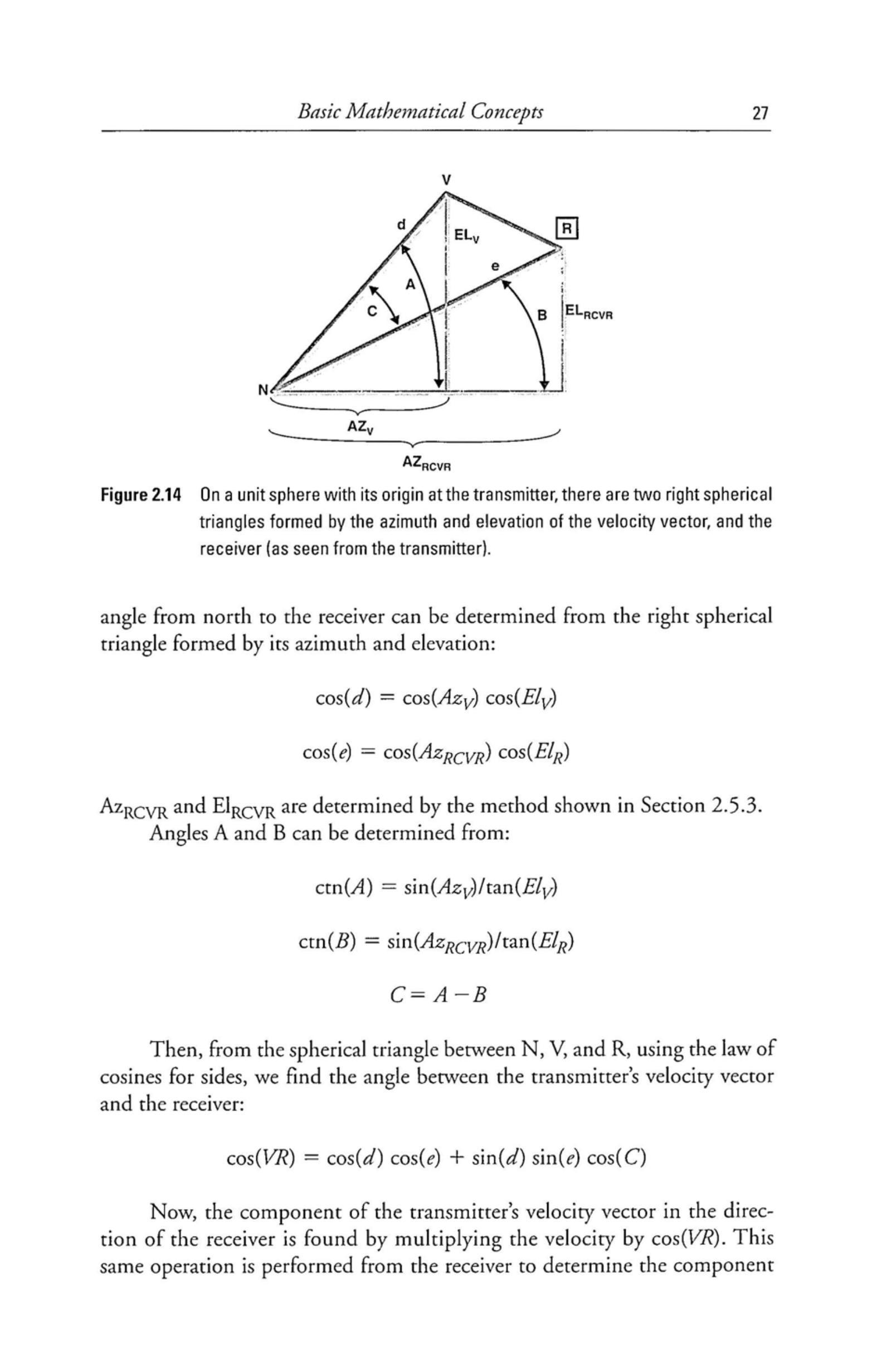 考虑发射机端的角度换算,如图 2.14 所示。在以发射机为球心的单位球面上,N 指向北,V 为速度矢量方向,R 指向接收机。速度矢量的方位角和俯仰角构成一个直角球面三角形;接收机的方位角和俯仰角也构成一个直角球面三角形: