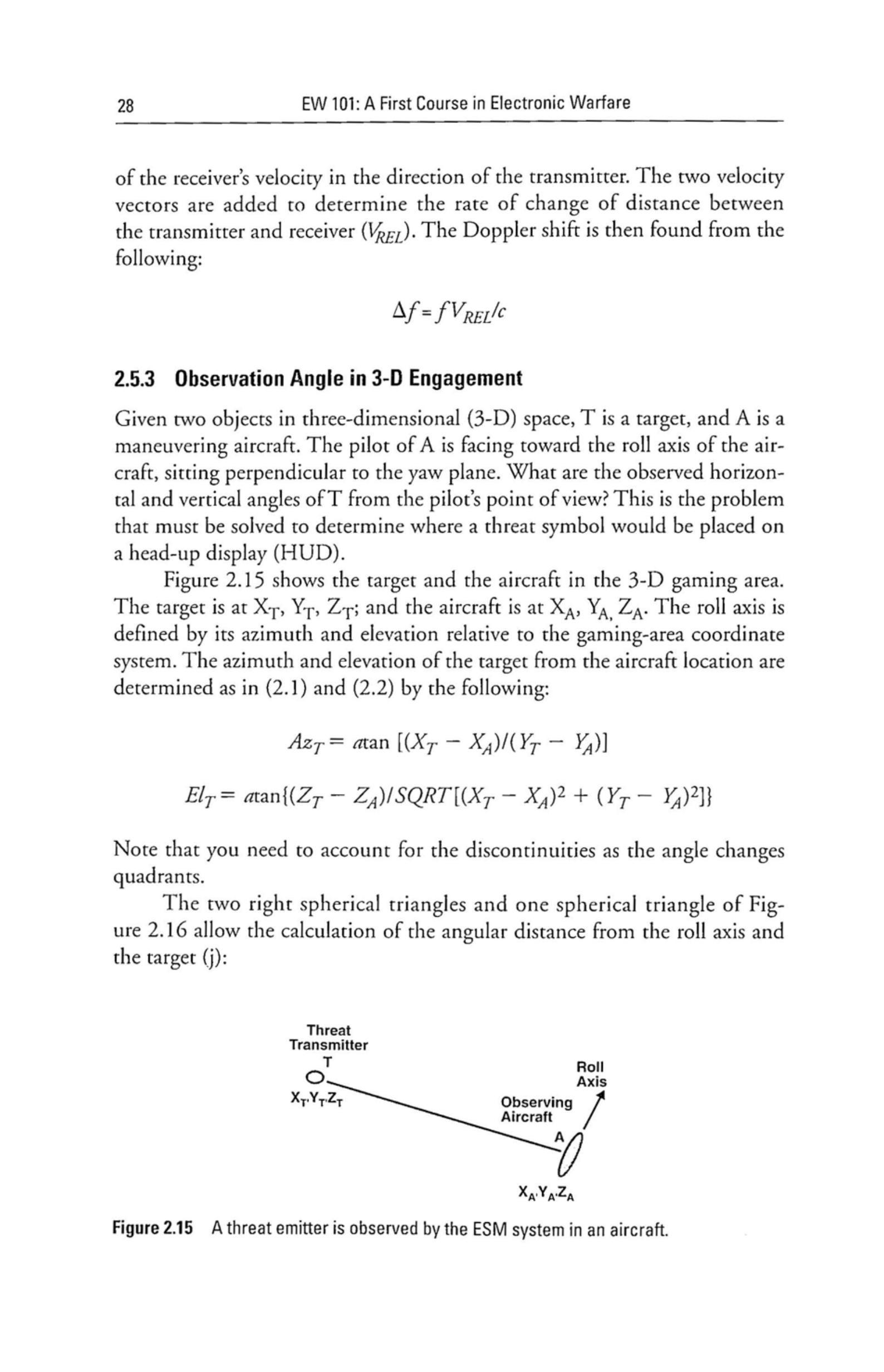 图 2.15 显示了目标与飞机在三维空间中的相对位置。目标位置为 \(X_{T}, Y_{T}, Z_{T}\);飞机位置为 \(X_{A}, Y_{A}, Z_{A}\)。滚转轴的方位与俯仰由相对于三维坐标系的角度定义。目标相对于飞机的方位与俯仰由公式 (2.1) 和 (2.2) 计算:
