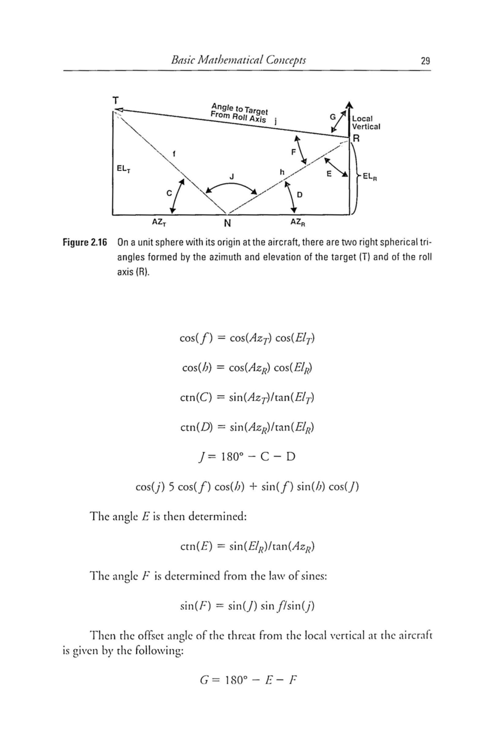 图 2.16 中的两个直角球面三角形和一个球面三角形用于计算目标与滚转轴之间的角距离 \(j\):