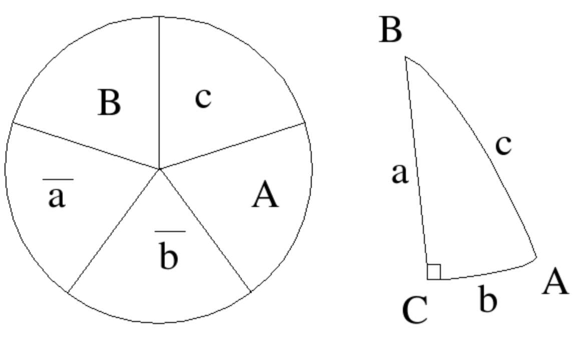 图 2.11 Napier 法则通过这个五分圆盘为直角球面三角形提供简化的方程。