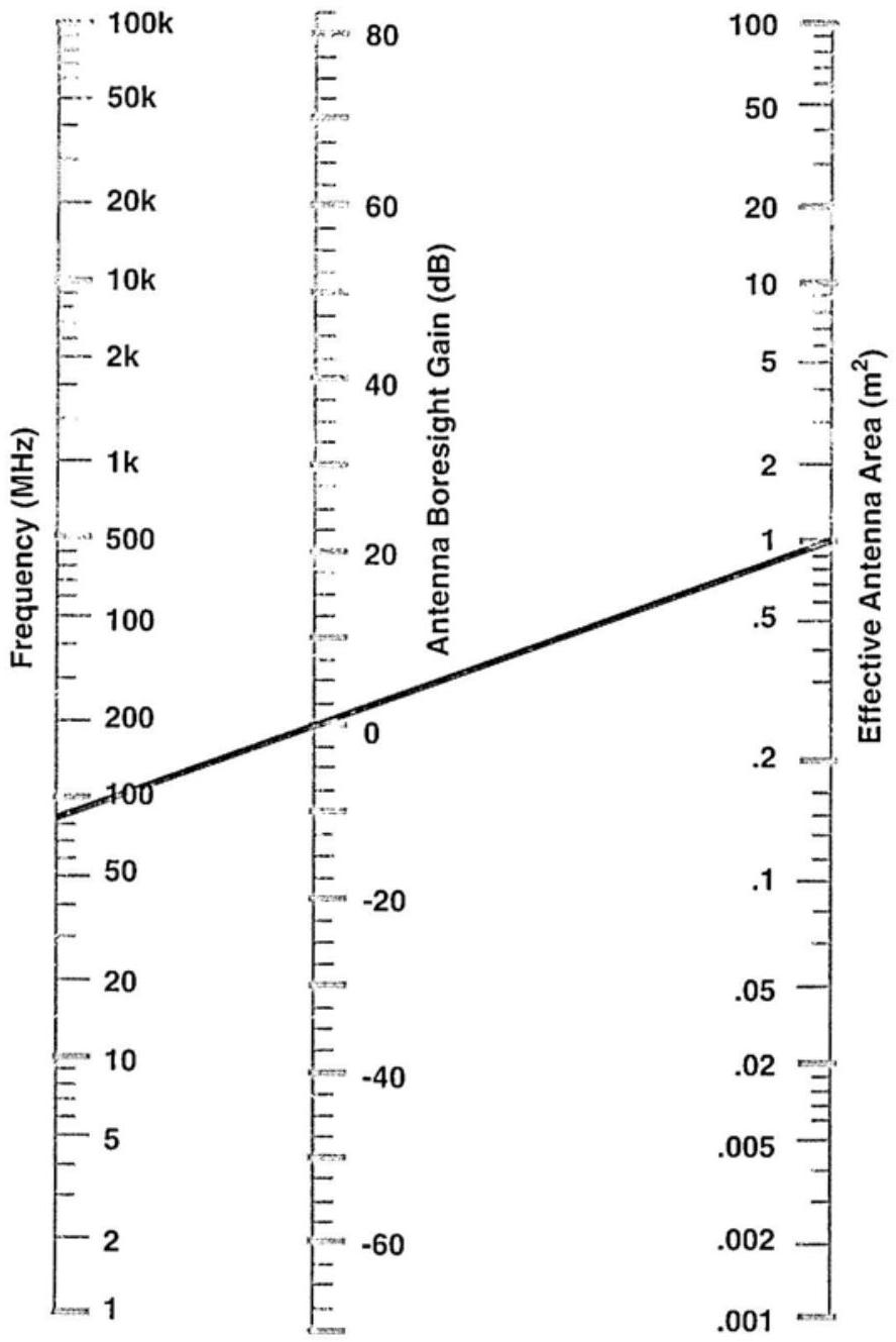 图 3.5 给出了工作频率、天线波束轴线增益与有效天线面积之间关系的标度图。图中曲线对应一副各向同性天线(\(0-\mathrm{dB}\) 增益),其有效面积为 \(1 \mathrm{~m}^{2}\)。可以看到,这大约发生在 85 MHz 时。该标度图的公式为: