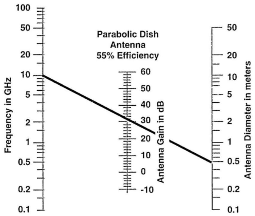图 3.6 是一张标度图,可以用来根据天线口径和工作频率确定天线增益。注意,该图特定于 \(55 \%\) 效率的天线。图中曲线表明,一个直径为 \(0.5 \mathrm{~m}\)、效率为 \(55 \%\) 的天线在 10 GHz 时的增益约为 32 dB。该标度图假设天线表面为在工作频率波长的一小部分范围内精确成形的抛物面,否则会产生增益下降。其公式为: