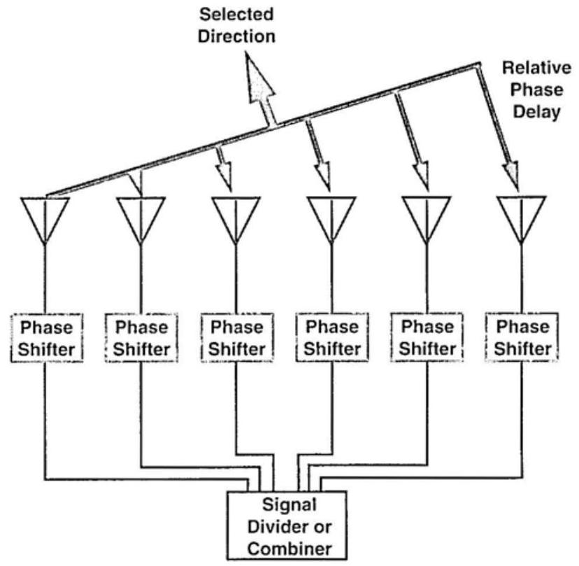 如图 3.7 所示,相控阵是一组天线,每个天线均连接一个移相器。当作为发射天线时,待发射的信号被分配到各个天线,且各天线的信号相位被调整,使得从某一选定方向观察时所有信号同相叠加——从而相干增强。由此推论,从其他角度观察时信号将不同相,因此叠加效果较差。由此形成天线波束。