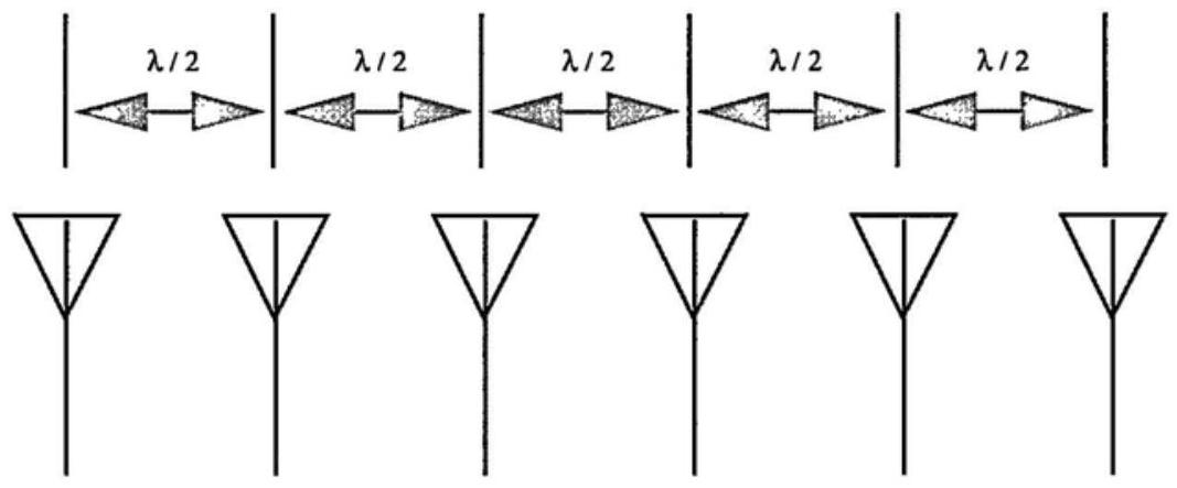 通常情况下,构成相控阵的各个天线单元的间距应为最高工作频率下的半波长,如图 3.8 所示。这可以避免出现“栅瓣(grating lobes)”,因为栅瓣会在波束扫描时降低天线性能。