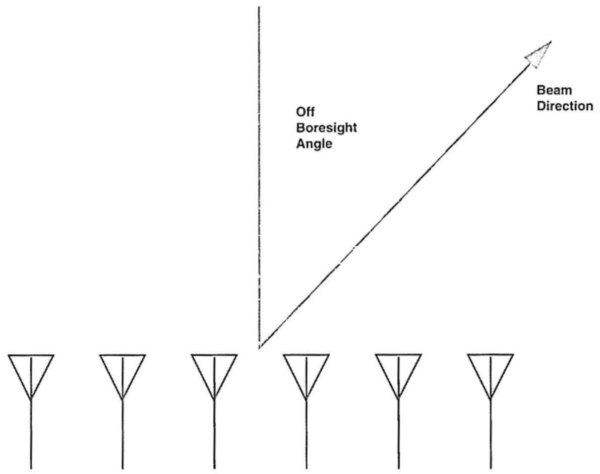 单元间距为半波长的相控阵最多只能从波束轴线偏转约 \(45^{\circ}\)。如果单元间距更小(降低了波束轴线增益),则可以扫描到 \(60^{\circ}\)。
