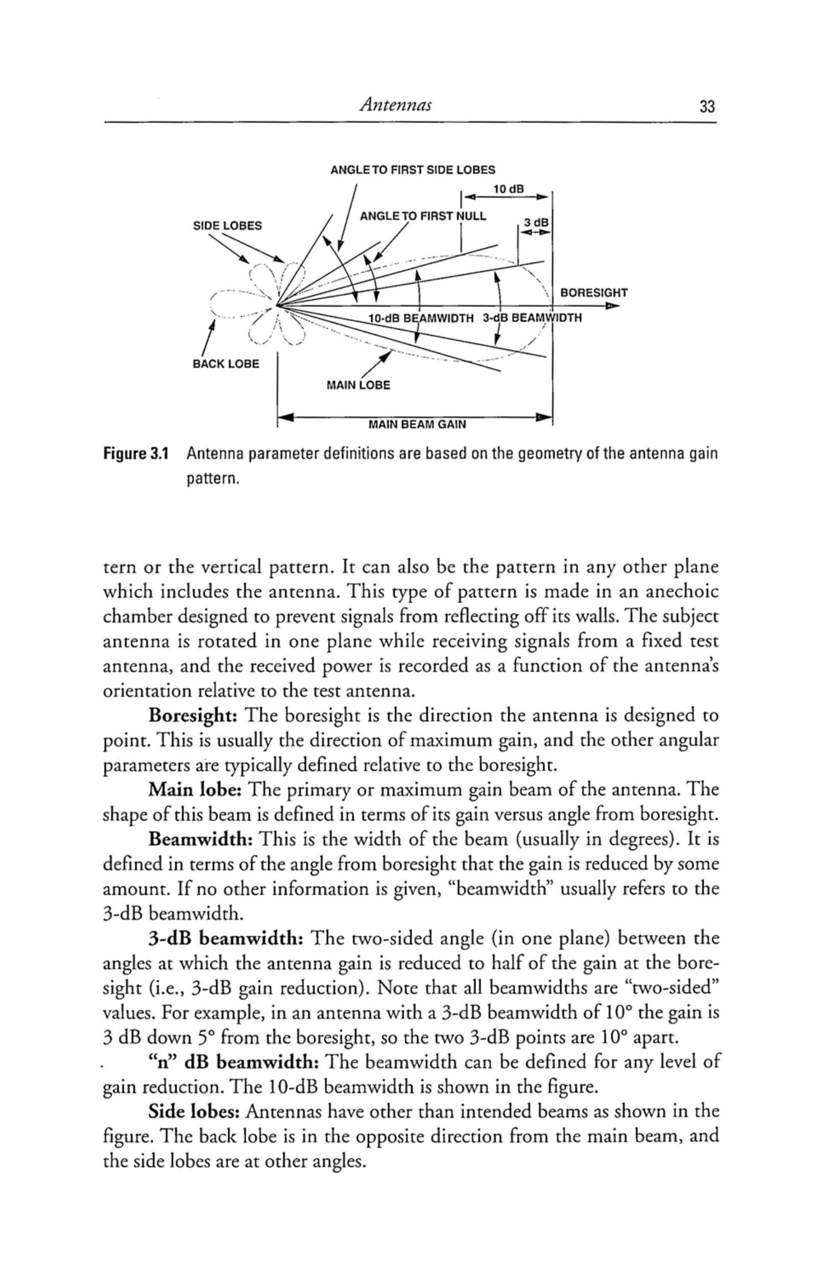 在整个电子战领域中,最重要(且经常被误解)的一个方面就是定义天线波束的各种参数。几个天线波束定义可以从图 3.1 描述,该图表示天线在某一平面内的幅度方向图。这可以是水平面方向图或垂直面方向图,也可以是包含天线的其他任何平面中的方向图。这种方向图是在消声室中测得的,该消声室的设计目的是防止信号从墙壁反射。被测天线在一个平面内旋转,同时接收来自固定测试天线的信号,并记录接收功率随天线相对测试天线的方向变化情况。