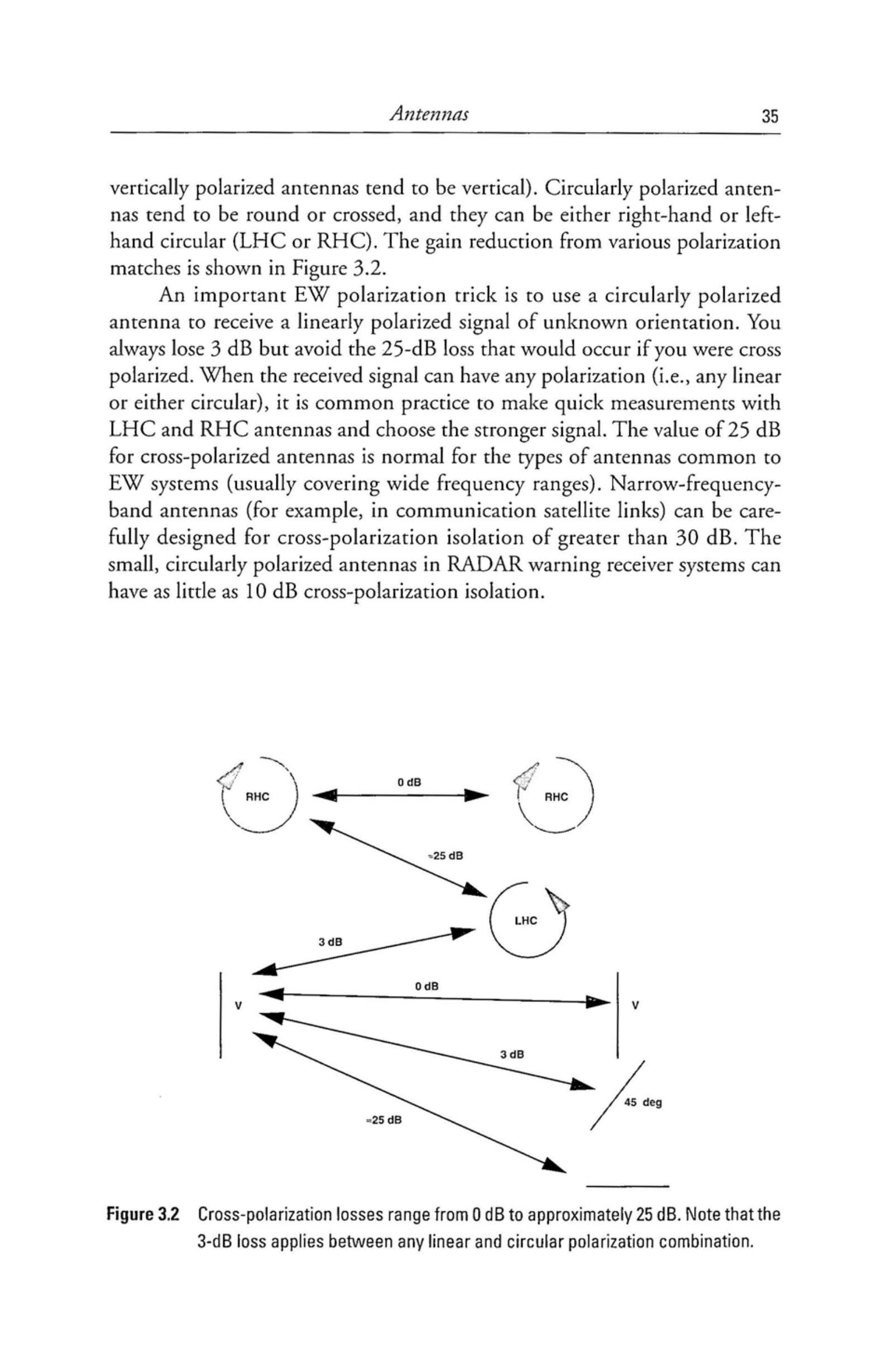 从电子战角度看,极化最重要的影响是:如果天线极化与接收信号极化不匹配,则接收功率会降低。一般情况下(但并非总是如此),线极化天线在几何形状上与极化方向一致(例如,垂直极化天线通常为垂直放置)。圆极化天线通常是圆形或交叉结构,可以是右旋或左旋(RHC 或 LHC)。各种极化匹配的增益损失如图 3.2 所示。