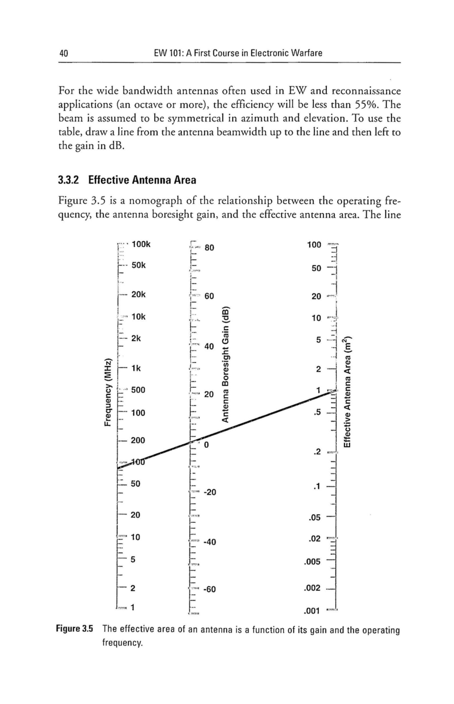在电子战和侦察应用中经常使用的宽带天线(一个倍频程或更多),其效率将小于 \(55 \%\)。假设波束在方位角和俯仰角上是对称的。使用该图时,从天线波束宽度画一条线到曲线,再向左读出增益(以 dB 表示)。