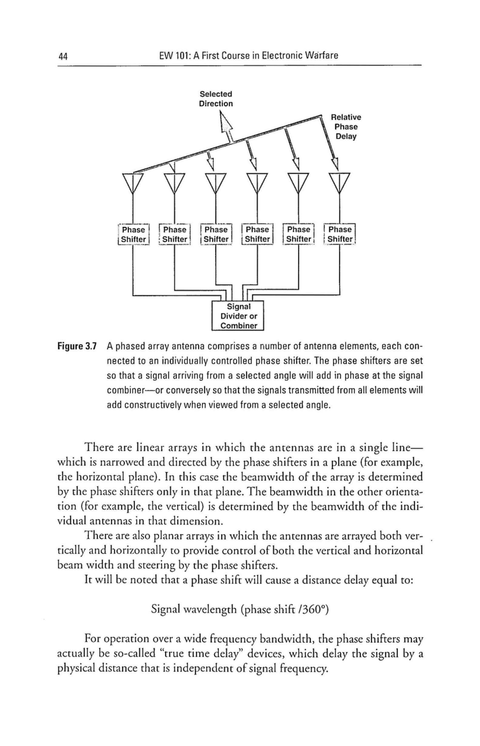 图 3.7 相控阵天线由若干天线单元组成,每个单元连接一个独立控制的移相器。移相器设置为使来自选定角度的信号在合成器中同相叠加——反之,从所有单元发射的信号在选定角度观察时相干增强。