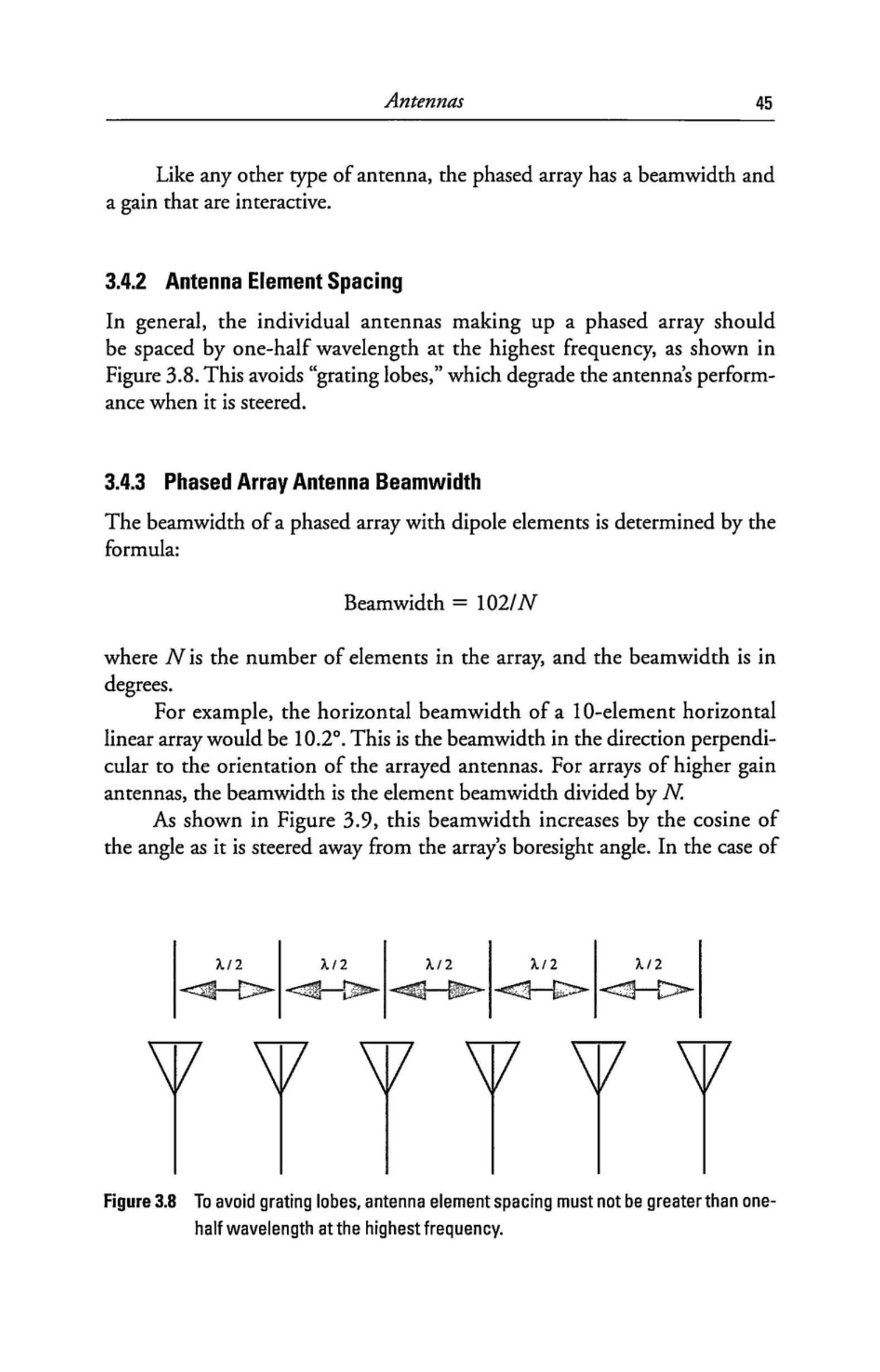 通常情况下,构成相控阵的各个天线单元的间距应为最高工作频率下的半波长,如图 3.8 所示。这可以避免出现“栅瓣(grating lobes)”,因为栅瓣会在波束扫描时降低天线性能。