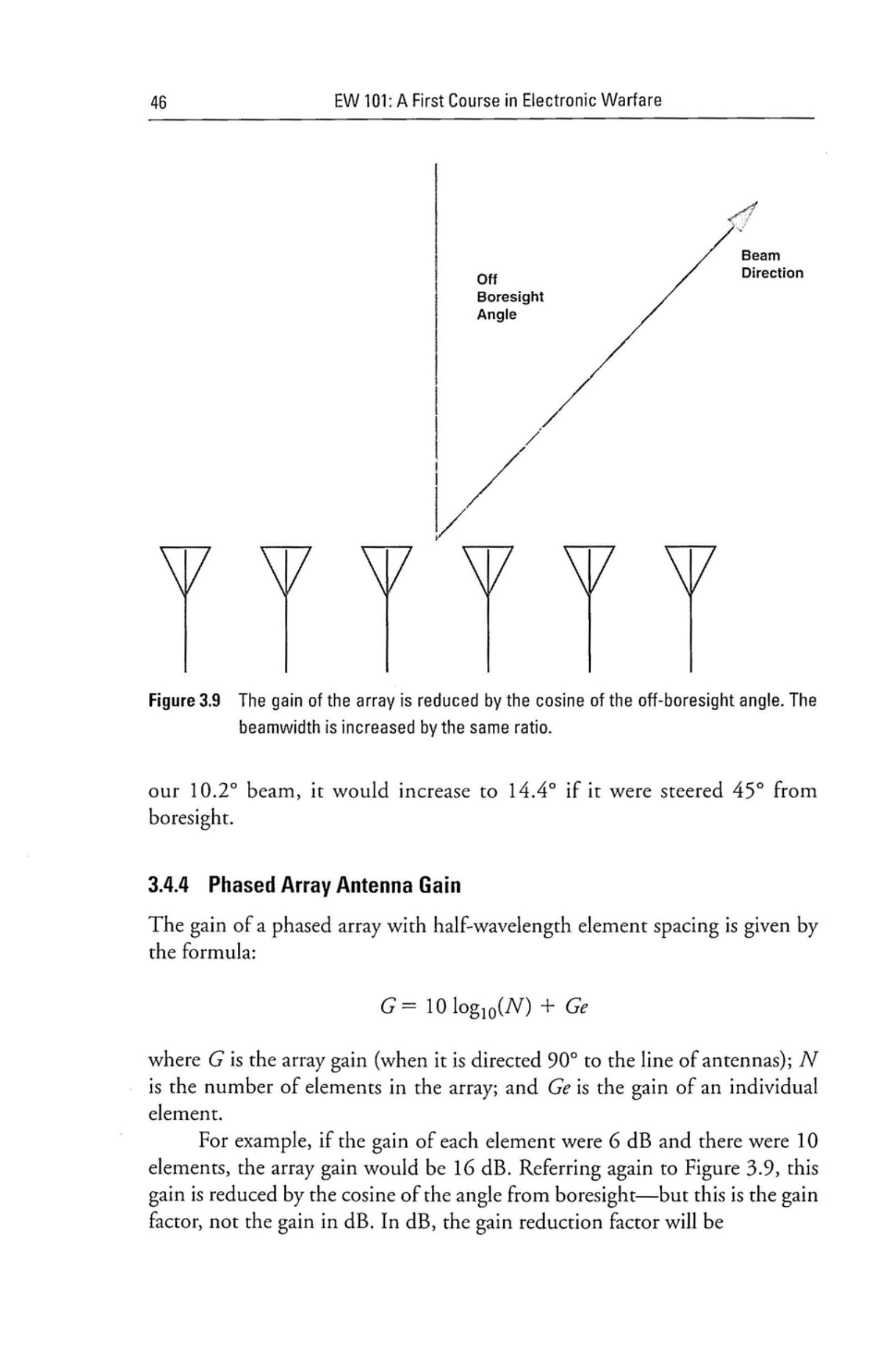 例如,如果每个单元的增益为 6 dB,总共有 10 个单元,则阵列的增益为 16 dB。再参考图 3.9,该增益会按偏离波束轴线角度的余弦函数减小——但这是线性增益因子,而不是 dB 形式。在 dB 形式下,增益减小因子为: