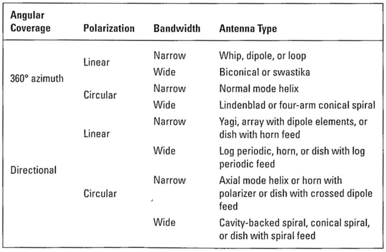 以下表格中还进一步按极化方式分类,最后按频率带宽分类(仅分为窄带或宽带)。在大多数电子战应用中,“宽带”意味着一个倍频程或更多(有时远超过一个倍频程)。