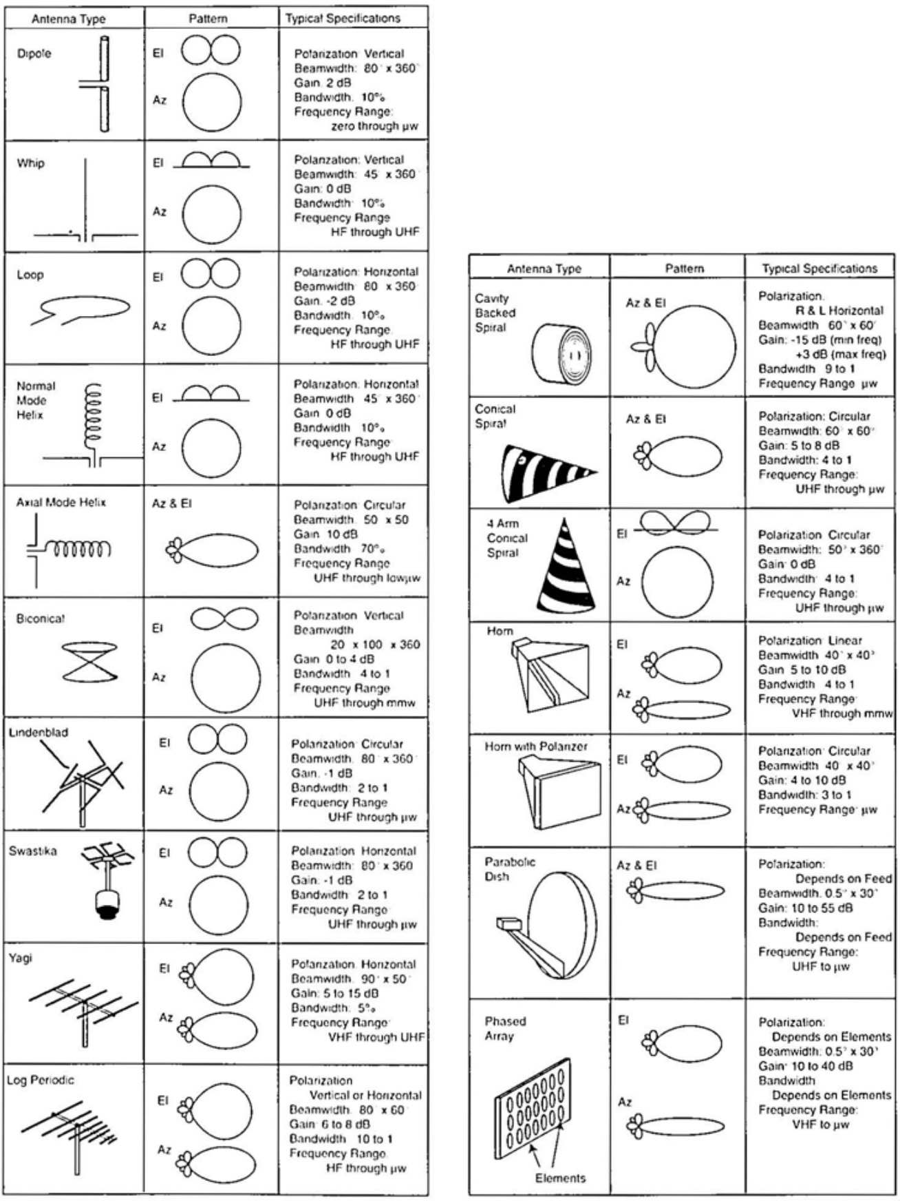 图 3.3 便于总结了电子战应用中各种类型天线的参数。对于每种天线类型,左栏展示了天线物理特性的粗略示意图。中栏展示了该类型天线在俯仰角和方位角上的大致增益方向图。只有这些曲线的一般形状是有用的——某一具体天线的实际增益方向图将由其设计决定。右栏则总结了预期的典型规格。这里“典型”是一个重要的词,因为参数的可能范围要宽得多。例如,理论上任何类型的天线都可以用于任意频率范围。然而,物理尺寸、安装方式和适用场景的实际考虑,使得某种天线类型通常被用于其“典型”的频率范围。