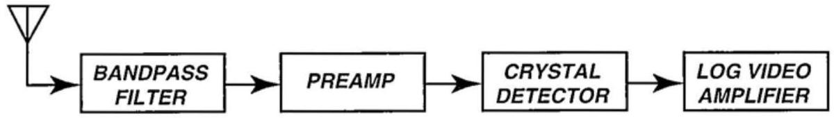 为了有用,晶体视频接收机通常在其前端接一个带通滤波器,以便只接收并输出某一感兴趣频段内的信号(例如 \(2-4 \mathrm{GHz}\))。通常,该类接收机中使用对数量程视频放大器,以提供宽动态范围。