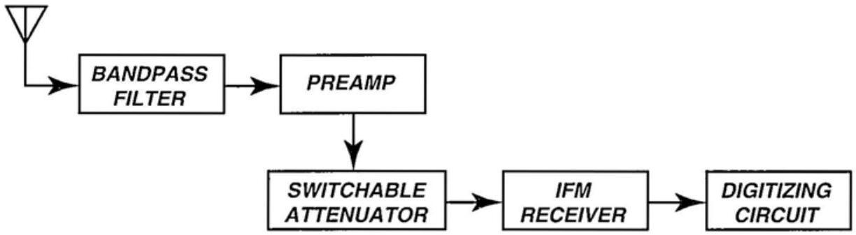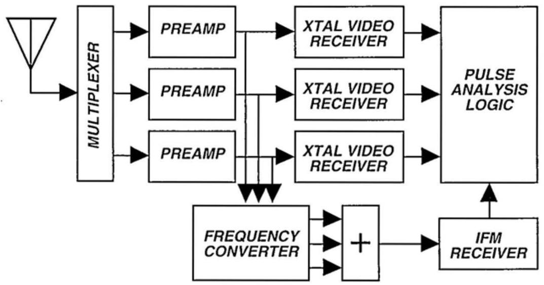 总体而言,晶体视频和瞬时频率测量(IFM)接收机用于在高密度脉冲信号环境下运行的低到中成本系统。它们都能提供宽频率范围的 \(100 \%\) 覆盖,但无法优雅地处理多个同时出现的信号。因此,在其频率范围内的任何高功率连续波信号都会严重降低其接收脉冲的能力。此外,它们灵敏度较低,因此最适合应对强信号。在现代系统中,它们通常与窄带接收机组合,以应对问题场景。
