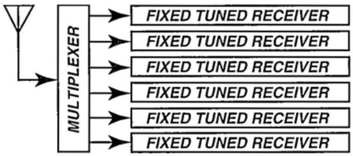 在必须监测单一信号(或始终位于单一频率的多个信号)的情况下,固定调谐接收机可能是合适的。它通常是一个真正的 TRF 接收机,或者是具有预设 LO 的超外差接收机。在任何情况下,该类接收机都能在单一频率下实现 \(100 \%\) 截获概率。