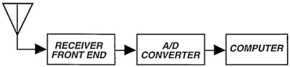 数字接收机似乎是未来的希望(见图 4.8)。它基本上通过数字化信号并在计算机中处理。由于软件可以功能性地模拟任何类型的滤波器或解调器(包括一些无法用硬件实现的),因此数字化信号可以被最优地滤波、解调、后检波处理等。